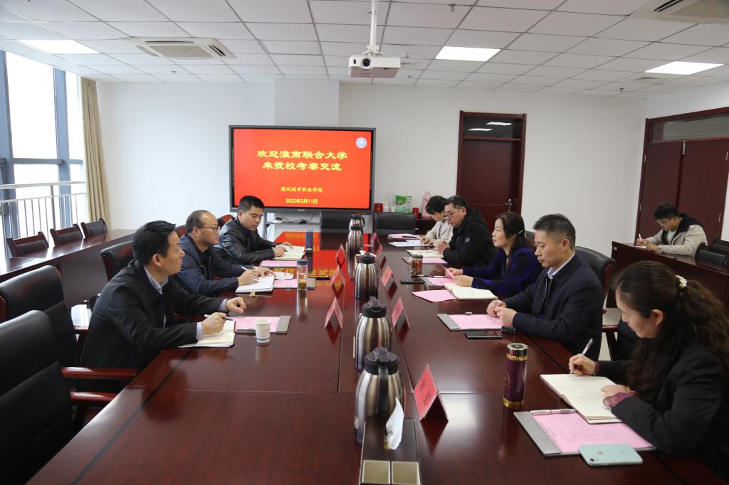 3月11日下午,淮南联合大学副校长罗鸿、学生处处长程李平、教务处处长黄伟一行3人到我校考察交流。校党委委员、副校长吴惠珍,党委委员、学生处处长杨如江,党委委员、教育学院院长高国柱,教务处副处长金虹及相关部门负责人参加交流会。会议由吴惠珍主持。