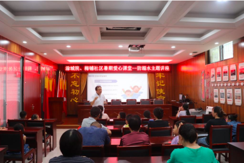 张志华一行在梅铺社区季凤的引导下参观了梅铺社区科普馆、文化室、党群活动中心等,现场观看了防溺水和溺水后急救的主题讲座、防溺水宣传的手势舞;在社区广场慰问了健康义诊的志愿者师生。