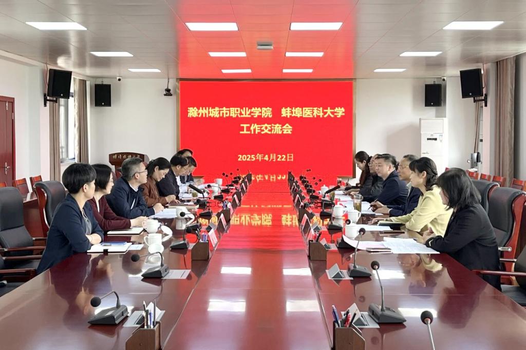 陈昌杰代表蚌埠医科大学对我校一行人的到访表示欢迎,她强调,两校合作是贯通职业教育与本科教育的重要举措,要密切协作配合,精准对接解决问题,持续加强两校间的优势互补和资源共享。汪上对蚌埠医科大学的支持表示感谢,并指出,联合培养项目是服务学生成长、满足区域经济社会发展需求的有效途径,期待双方在课程衔接、师资共建、实践教学、学生活动、资源共享等方面深化合作。
