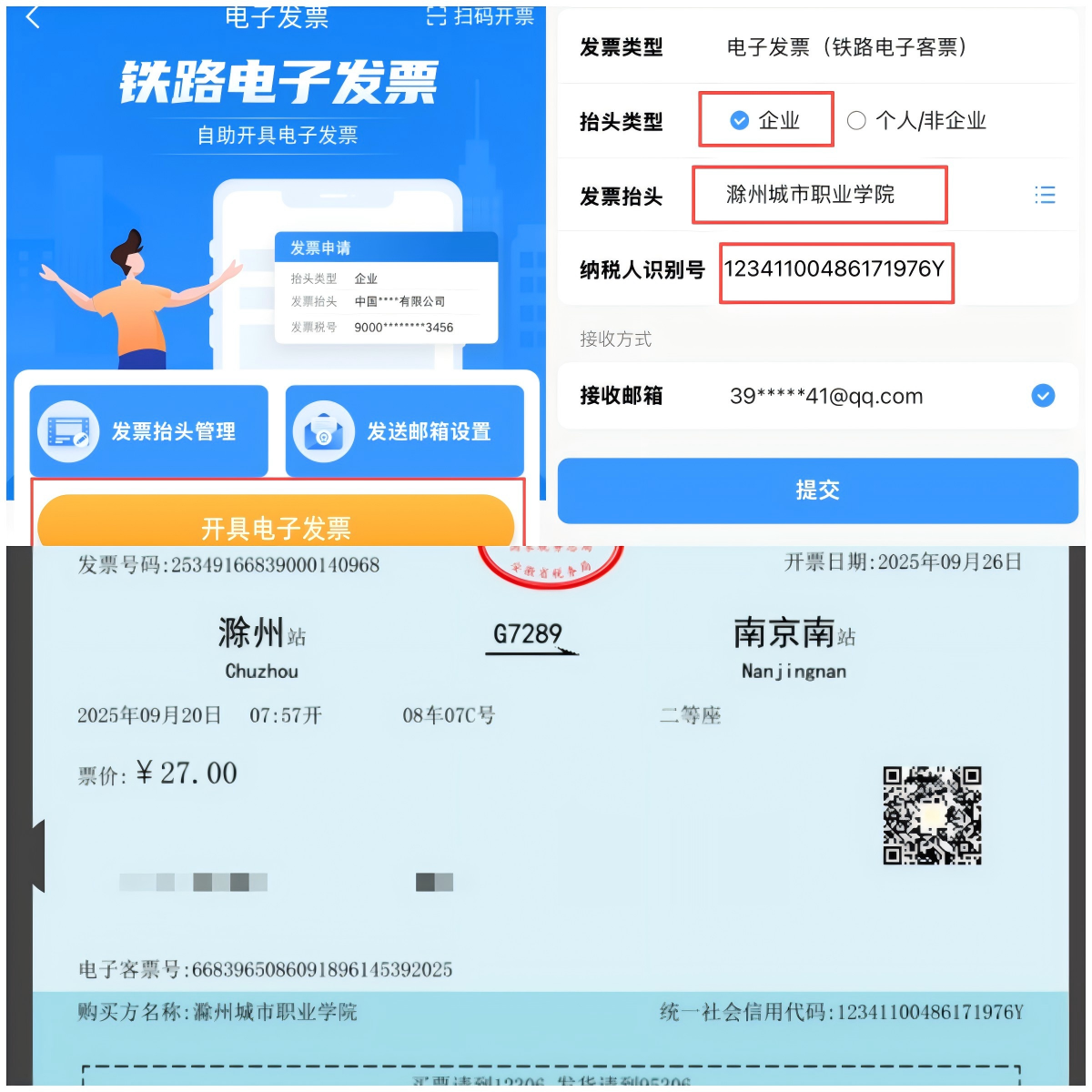 12306 APP→订单→电子发票→选中行程→填写开票信息→核对开票信息→发送至邮箱或下载发票。