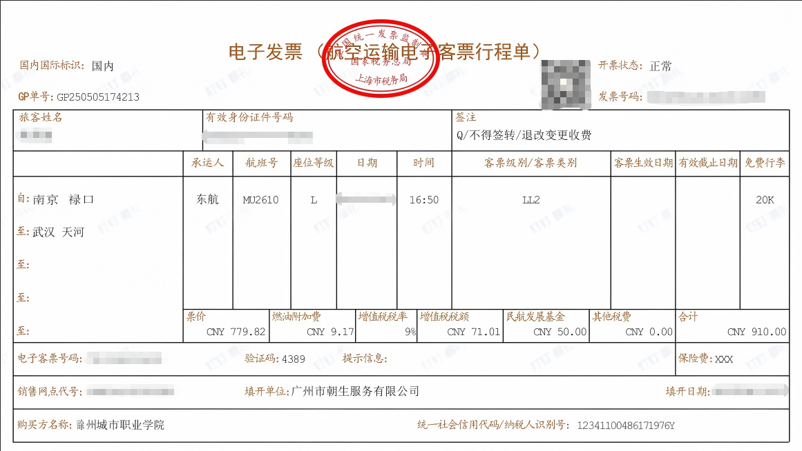 若开具数电发票,须在备注栏填写以下信息:乘机人、航班号、行程信息、舱位及登机时间。