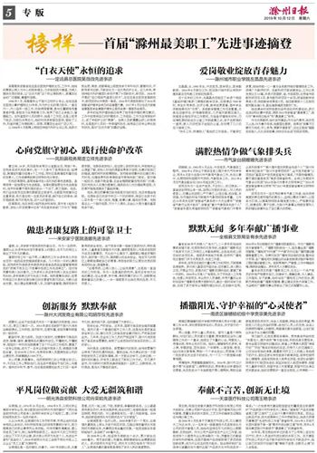 左晶晶老师的先进事迹以《爱岗敬业绽放青春魅力》为题刊登在10月12日的《滁州日报》上,这是左晶晶老师的光荣,更是我们滁州城市职业学院的骄傲。