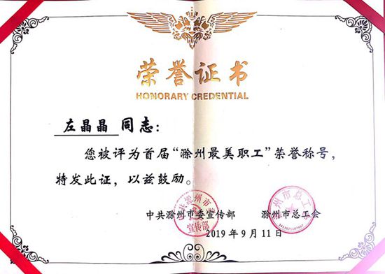 在首届“滁州最美职工”推荐评选活动中,按照公平、公正、公开的原则,通过学院推荐、预审筛选、网络投票、专家评审、综合评定及网上公示等环节,我院左晶晶由于表现突出,事迹感人,2019年9月,被评选为首届“滁州最美职工”。