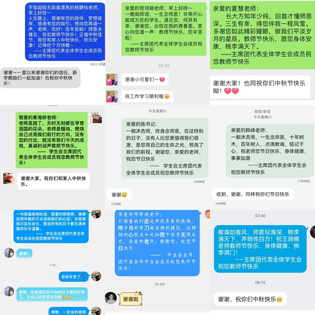 同学们还通过短信留言的方式,表达了他们对老师的浓浓情意与衷心祝福,祝愿老师“双节快乐”!