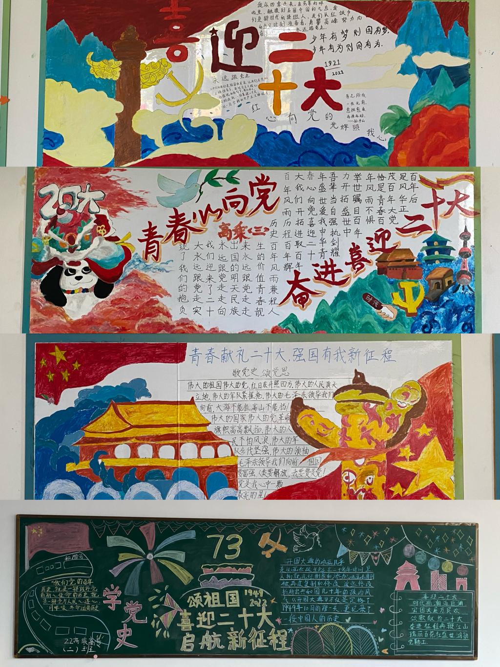 开展“青春心向党 喜迎二十大”主题板报评比。各班同学积极参与,把对节日的期盼,对祖国美好的祝福都赋予在小小的板报上,一笔一画,构思精细,匠心独运,描绘了祖国的山河壮美,表达对祖国生日的深深祝福。