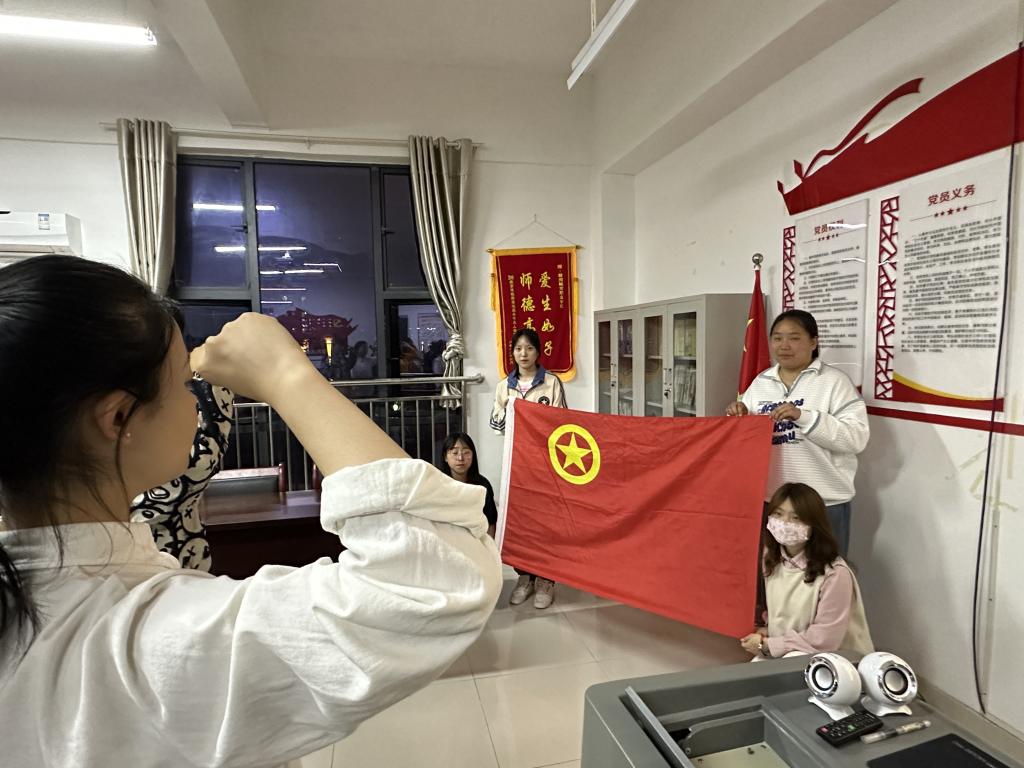 在庄严的国歌声中,管理与信息学院2023年新团员入团仪式拉开序幕。团总支组织委员张晓雅宣布12名新团员名单,各班优秀团员代表给新团员佩戴团徽。在鲜艳的团旗前,新团员肃立宣誓,老团员重温入团誓词,响亮的誓言在会议室久久回荡。
