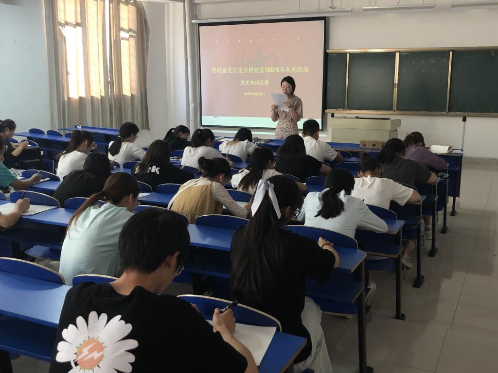为庆祝中国共产党成立100周年,深入推进党史学习教育,引导广大群众一起学党史、知党情、跟党走。6月22日,管理系党总支开展“永远跟党走,强国伴我行”党史知识竞赛,管理系全体入党积极分子参加竞赛。
