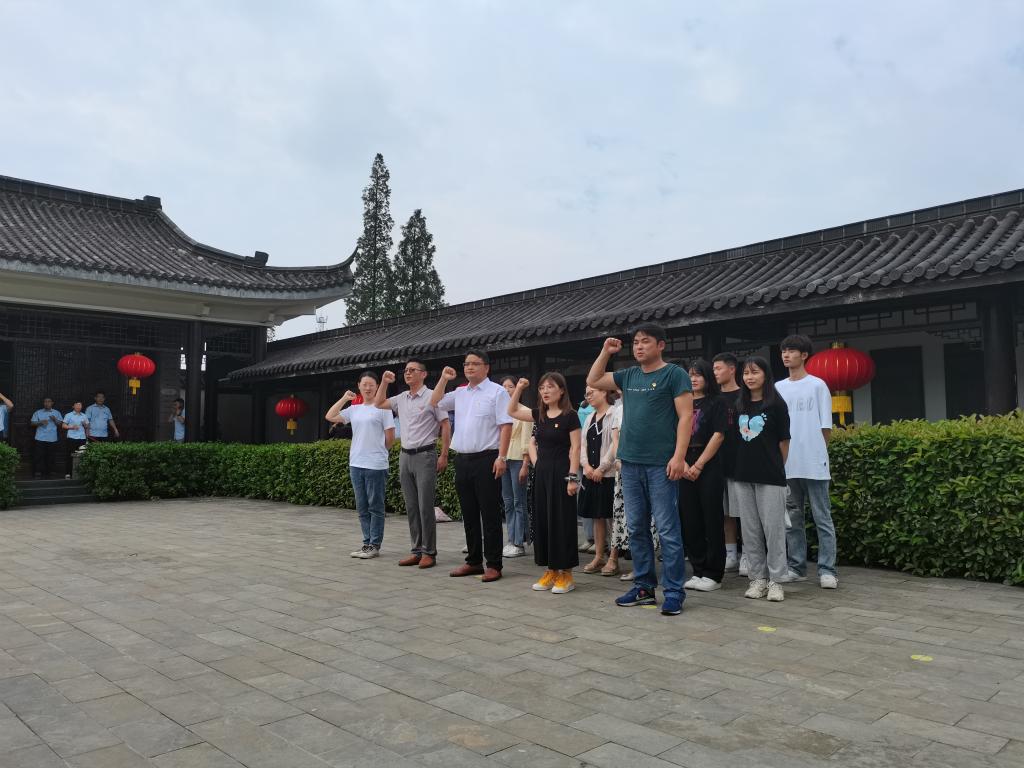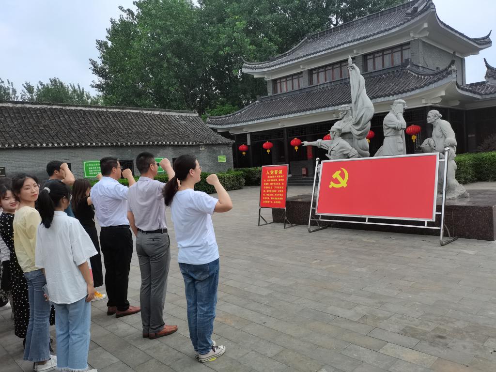 在纪念馆内的雕塑前,党员教师面对鲜红的党旗,举起右手,庄严宣誓,重温了入党誓词,表达了不忘初心、牢记使命、艰苦奋斗、永远跟党走的坚定政治信念。