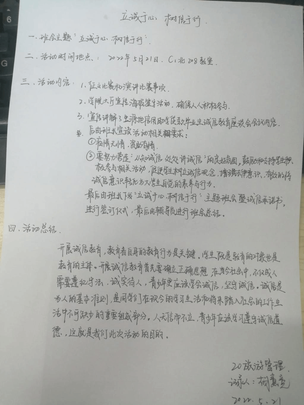 为推动国家助学贷款工作持续健康发展,提高大学生诚信意识,强化资助工作育人成效,依据校学函【2021】5号文件精神,我院落实学生处《关于开展学生资助诚信教育主题活动月的通知》,积极开展以“ 立诚于心,树信于行”为主题、以“立德树人” 为主线的学生资助诚信教育主题活动,管理与信息学院于5月上旬积极组织发动学生,制定详细计划,成功开展了一系列丰富多彩的形式活动,组织在校学生诚信签字和宣讲活动;组织开展诚信资助月系列活动之主题班会和承诺书签名活动;通过网络平台召开了生源地信用助学贷款毕业生诚信教育座谈会;开展了“学党史,诚消费”主题教育活动。