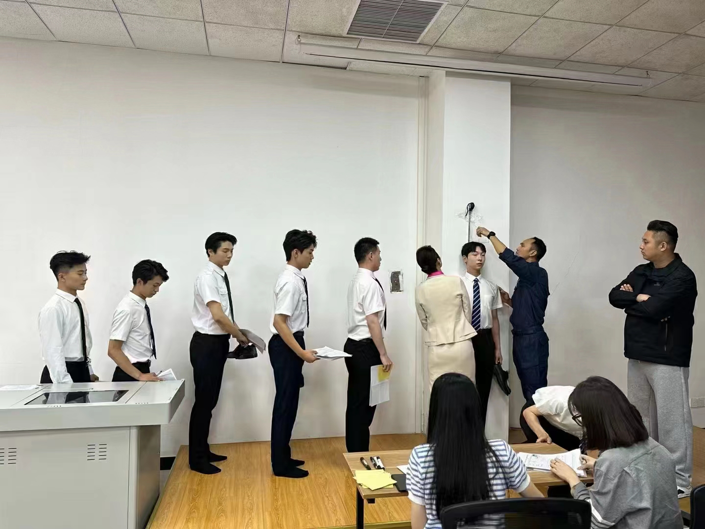 初检结束后,通过筛选的同学进入初试环节。初试流程按照身高、体重、年龄、特长、优势等进行自我介绍。学生们通过自我介绍向面试官展现最优秀的职业形象方面,给面试官们留下了深刻的印象。