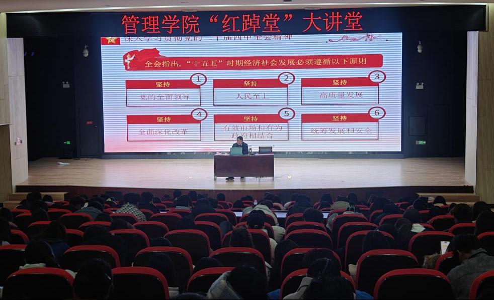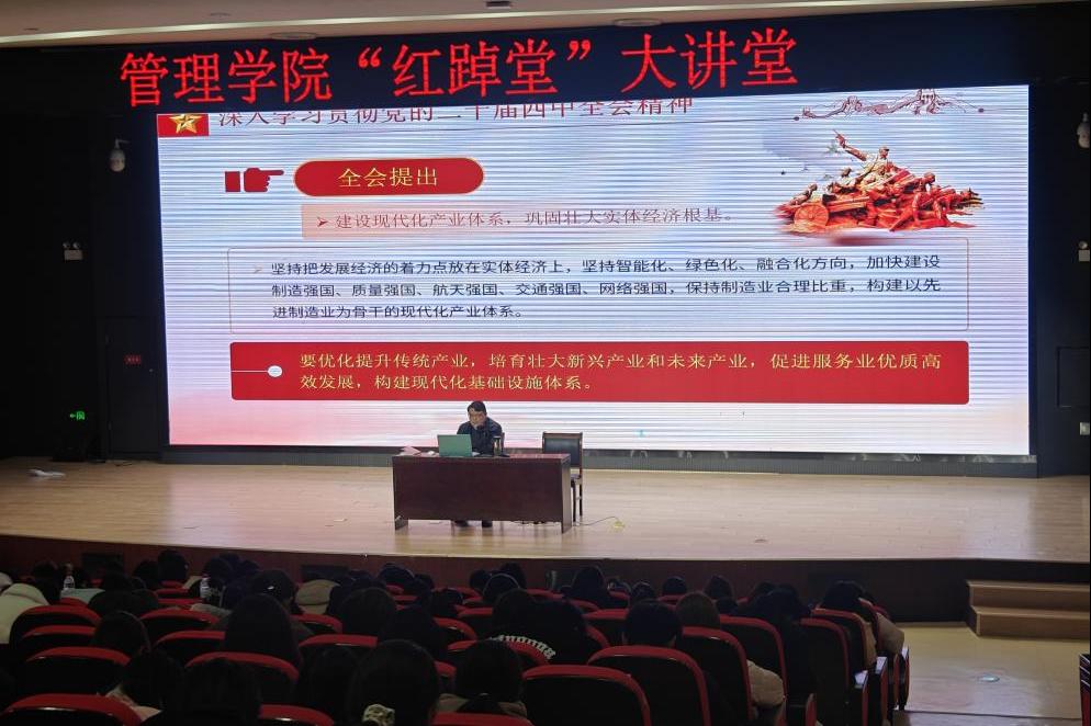 为引导入党积极分子深刻领会党的二十届四中全会精神,筑牢理想信念根基,11月28日下午,管理学院在润德楼四楼报告厅举办管理学院“红踔堂”大讲堂:深入学习贯彻党的二十届四中全会精神专题讲座。管理学院党总支书记陈兴旺担任主讲人,全院共300余名师生齐聚现场,认真学习聆听。