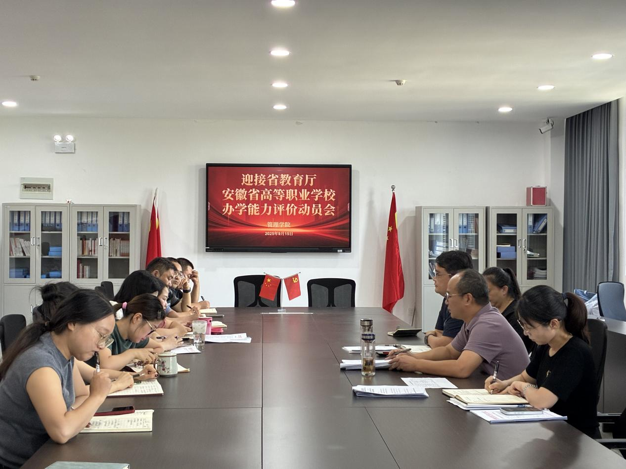 为深入贯彻落实《安徽省高等职业学校办学能力评价实施方案(2025—2030年)》精神,积极响应学校办学能力评价工作部署,9月15日上午,管理学院在润德楼301会议室召开办学能力评价工作动员会。学院党政班子成员参加会议,会议由学院党总支书记陈兴旺主持。