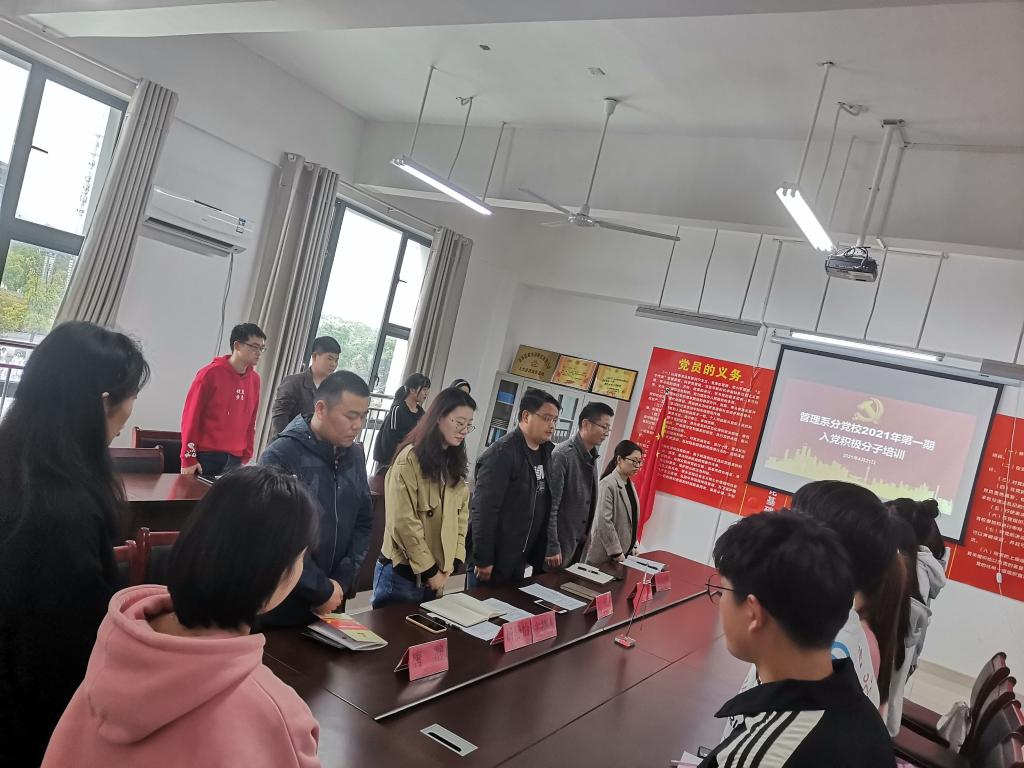 会议第三项,由管理系党总支副书记陈兴旺讲话。陈兴旺通过向学员们介绍入党积极分子培训的目的及意义,指出入党积极分子培训是每一位要求进步的同学的必修课,也是一项政治纪律,他希望每位入党积极分子能够做到:1.认真听讲,做好笔记,通过学习培训,了解党的基本理论和基本知识,熟悉入党程序,提高思想觉悟,不仅要做到从组织上入党,更主要的是要从思想上入党;2.作为入党积极分子,一定要用共产党员的标准严格要求自己,做学习的模范,在班级工作中,要主动发挥积极作用,自觉遵守学校规章制度,行为规范、诚实守信;3.校培训是暂时的,但党的知识和党的理论学习却是永远的,希望大家在课余时间认真自学入党积极分子培训教材的内容,积极参加课后讨论和党校实践,争取以优异成绩顺利结业。