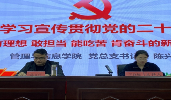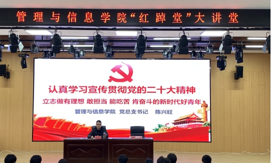 举世瞩目的中国共产党第二十次全国代表大会已于2022年10月22日胜利闭幕。为了进一步提高我院优秀青年学子对党的性质和宗旨认识,了解党的路线、方针和政策,坚定共产主义理想信念,10月28号下午管理与信息学院党总支书记陈兴旺为入党积极分子作题为《认真学习宣传贯彻党的二十大精神——立志做有理想 敢担当 能吃苦 肯奋斗的新时代好青年》专题讲座。