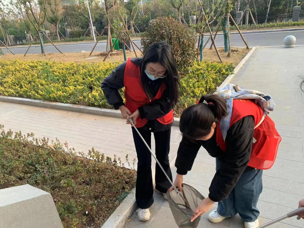 活动中,党员教师和学生入党积极分子身着红色志愿者马甲,三五人一组分头行动,齐心协力、相互配合,有的拿着扫把和簸箕清理步道枯叶,有的用垃圾夹深入绿化带清理卫生死角杂物......大家干劲十足,充分发扬不怕苦,不怕累的精神。