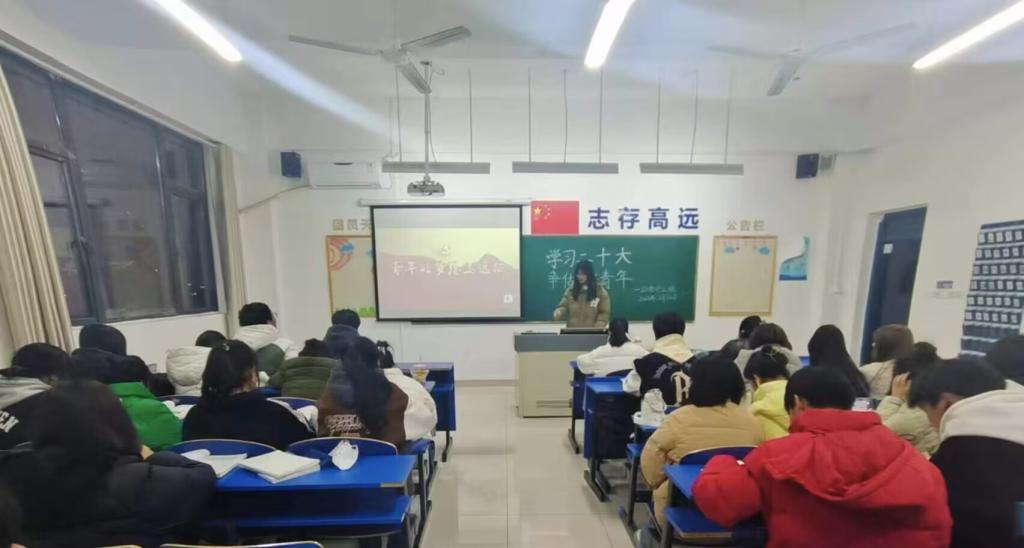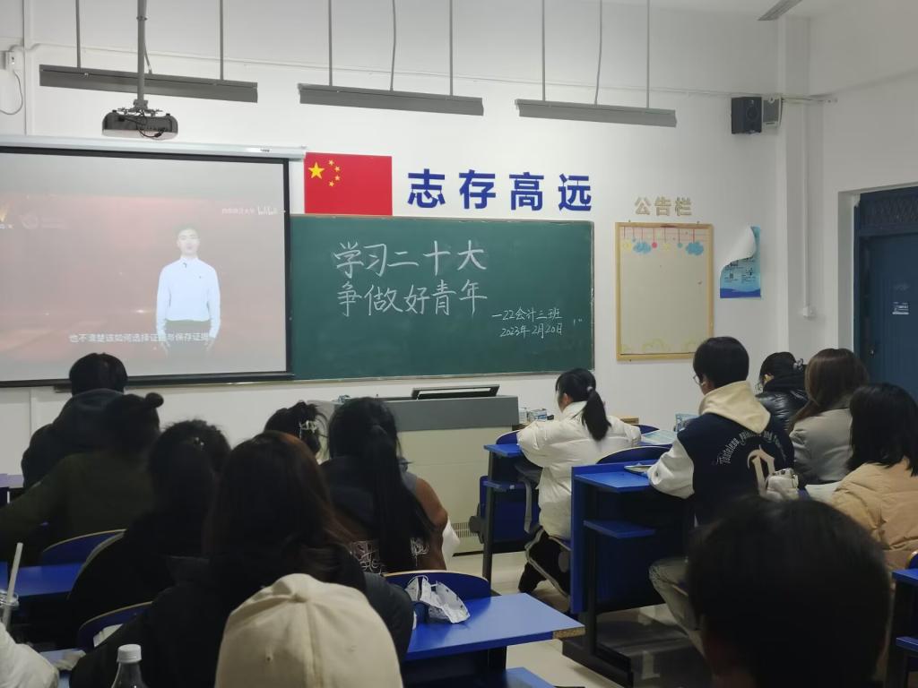 为深入学习贯彻党的二十大精神,全力推进党的理论进课堂,深入学生思想政治教育,管理与信息学院22会计高专3班开展学习二十大,争做好青年主题学习教育,号召同学们树立远大理想,感党恩、听党话、跟党走。