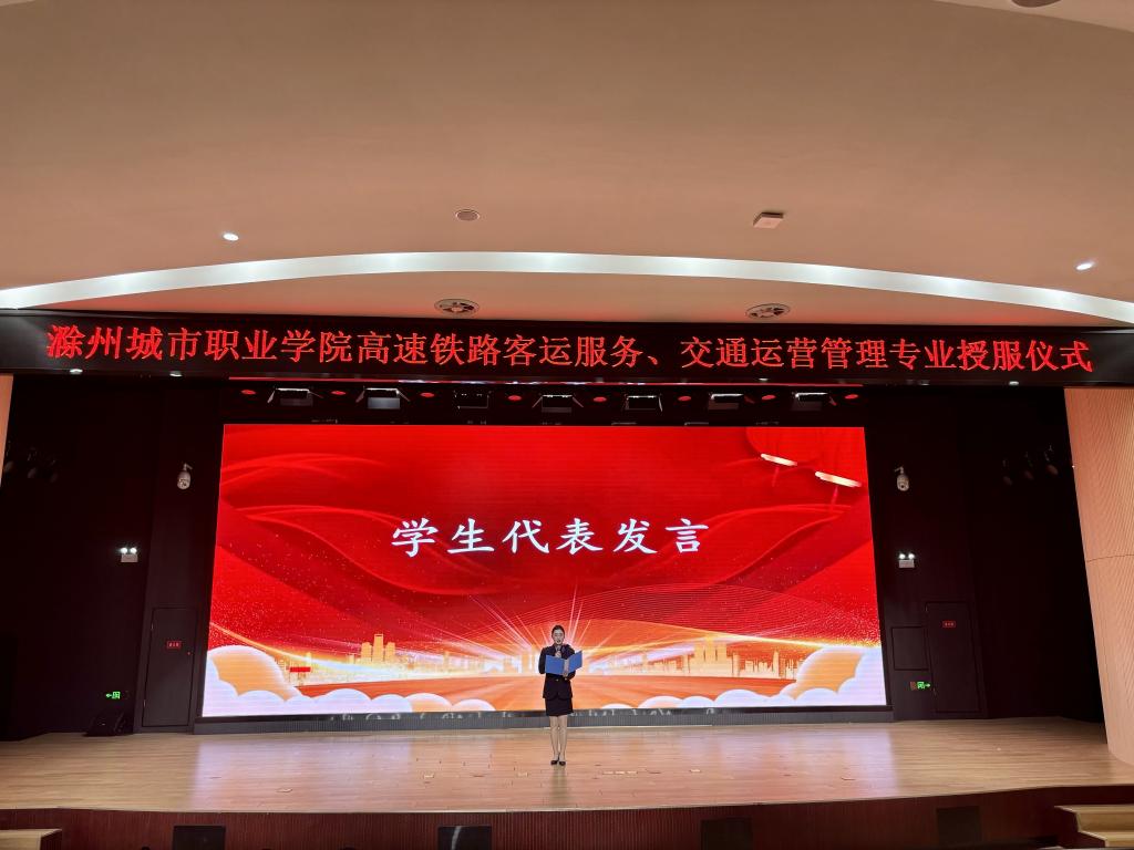 发言结束后,授服环节正式开始。领导嘉宾依次走上台,为高速铁路客运服务专业和交通运营管理专业的同学们逐一颁发制服。这一庄重仪式意味着同学们正式踏上了专业学习的征途,成为了一名准城轨行业人,肩负起了行业使命。23级高速铁路客运服务专业的陈玉轩同学唱响歌曲《奔跑》,用歌声唱出追逐梦想的坚定信念。