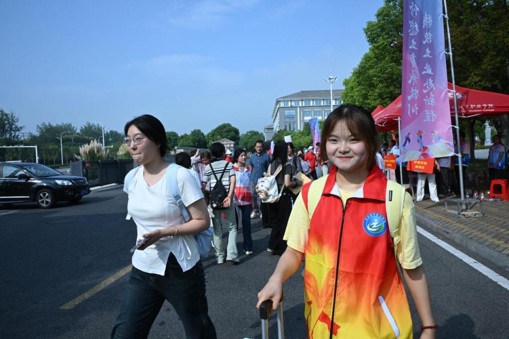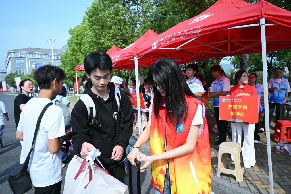学校南北校门的迎新服务点同步启用。管理学院志愿者与工作人员协同联动,构建起“校门接应 — 全程护送 — 体育馆报到” 的全链条服务模式。清晨一开始,志愿者们便积极主动地为新生接过行李,在护送途中,一边带领新生领略校园风貌,一边详细解读报到流程与大学生活注意事项,以暖心陪伴助力新生快速融入校园环境,消除陌生感与不适感。