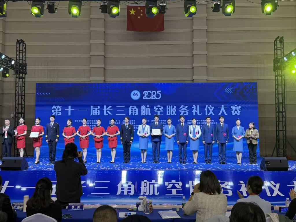 11月11日,第十一届长三角航空服务礼仪大赛在安徽滁州中航未来华东航空实训基地盛大举行。本次大赛由上海市航空学会主办,上海航宇科普中心,滁州城市职业学院承办,大赛旨在提升航空服务质量,弘扬航空文化,促进长三角地区航空院校的交流与合作。吸引了来自上海、安徽、浙江、江苏的长三角地区多家航空院校的15支精英代表队齐聚一堂,同台竞技,演绎了一场关于专业热情与优雅的空中服务盛宴。经过激烈角逐,我校空中乘务专业代表队凭借出色表现荣获团体二等奖,为学校赢得了荣誉。
