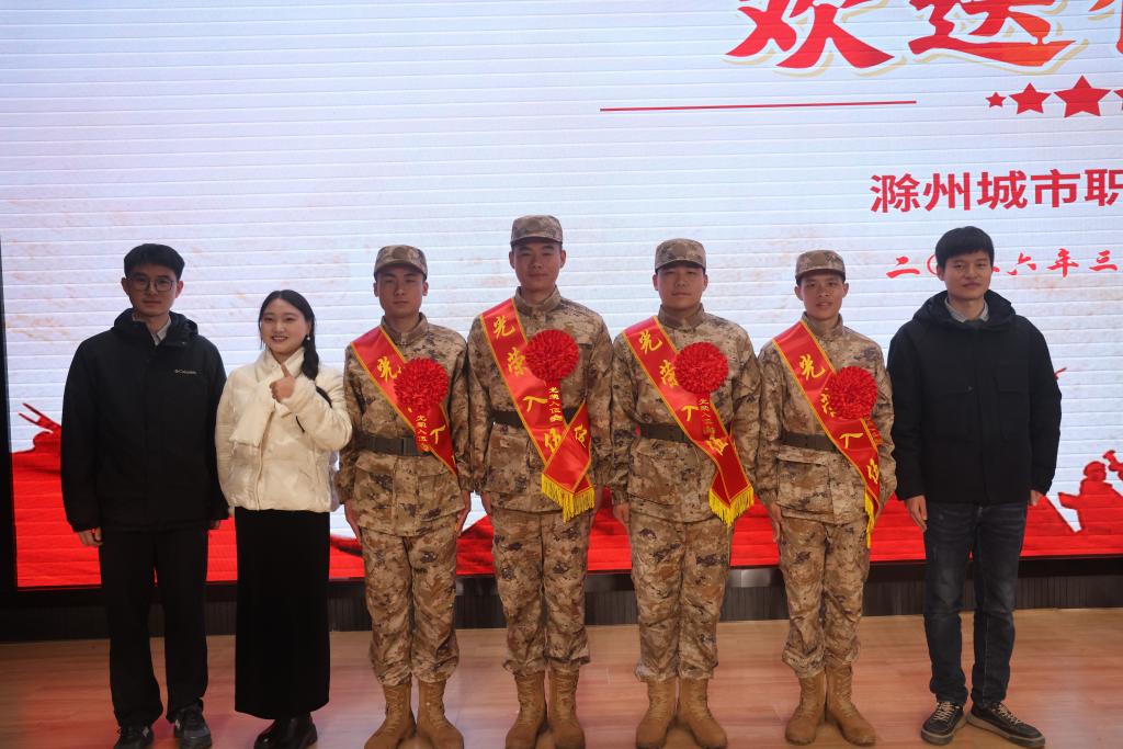 为深入贯彻落实国家征兵工作部署,激发青年学子爱国热情,强化国防意识,3月13日上午,滁州城市职业学院2026年上半年新兵入伍送兵仪式隆重举行。管理学院凡航宇、刘旭峰、张子阳、林松等四名优秀学子经过层层选拔,光荣应征入伍,即将奔赴军营,开启军旅生涯。