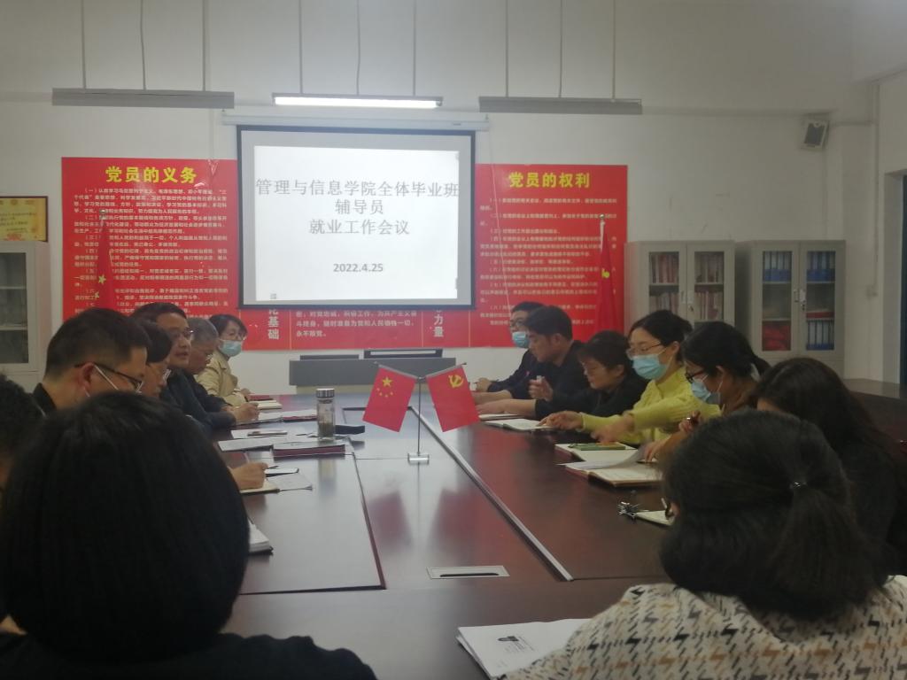 在疫情防控特殊时期,为进一步落实就业推进工作,管理与信息学院于4月25日下午在院会议室召开毕业班辅导员(班主任)就业工作专题会议,院党总支书记陈兴旺、院长陈素霞、学管秘书唐静以及毕业班级辅导员(班主任)参加会议,会议由陈兴旺主持。