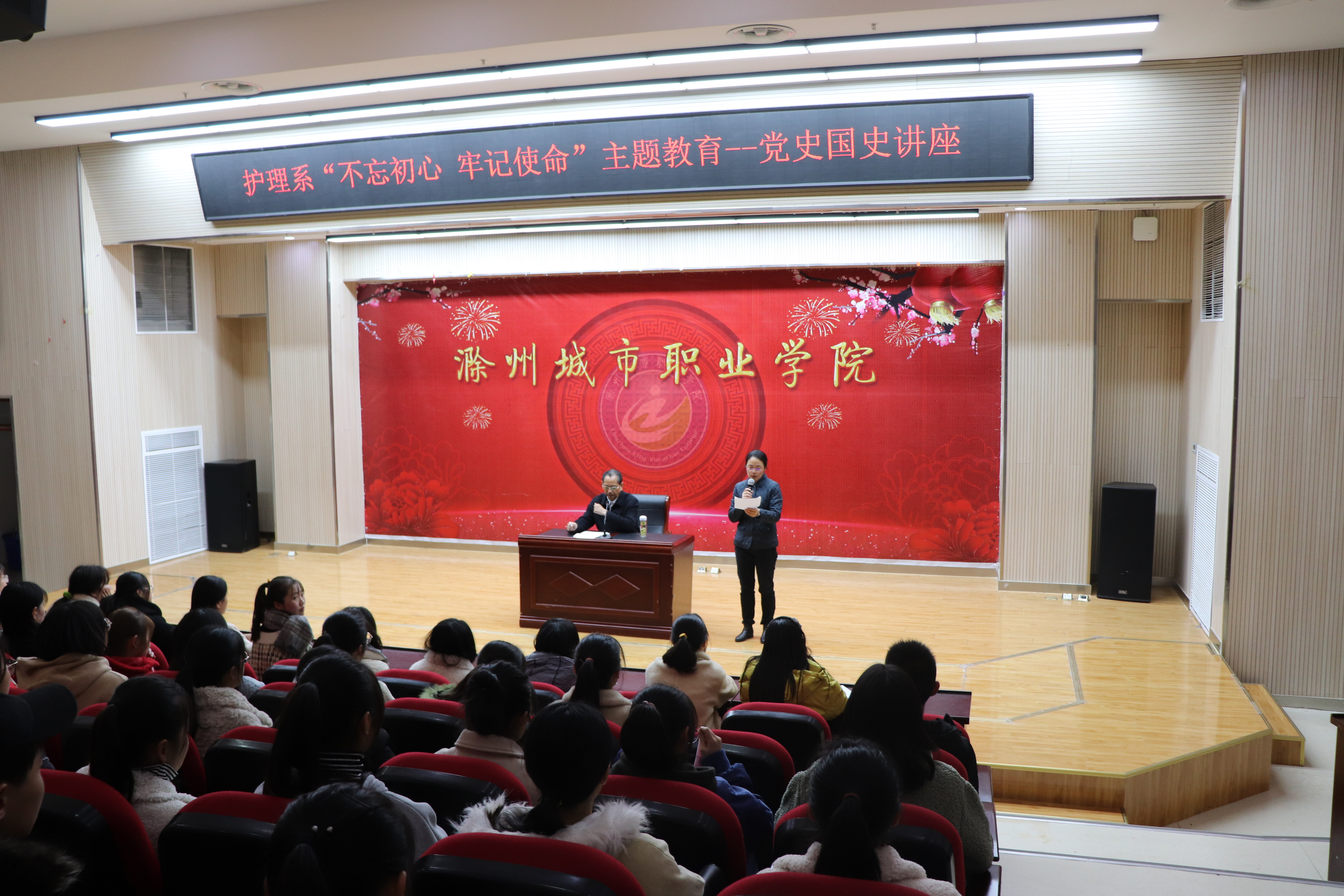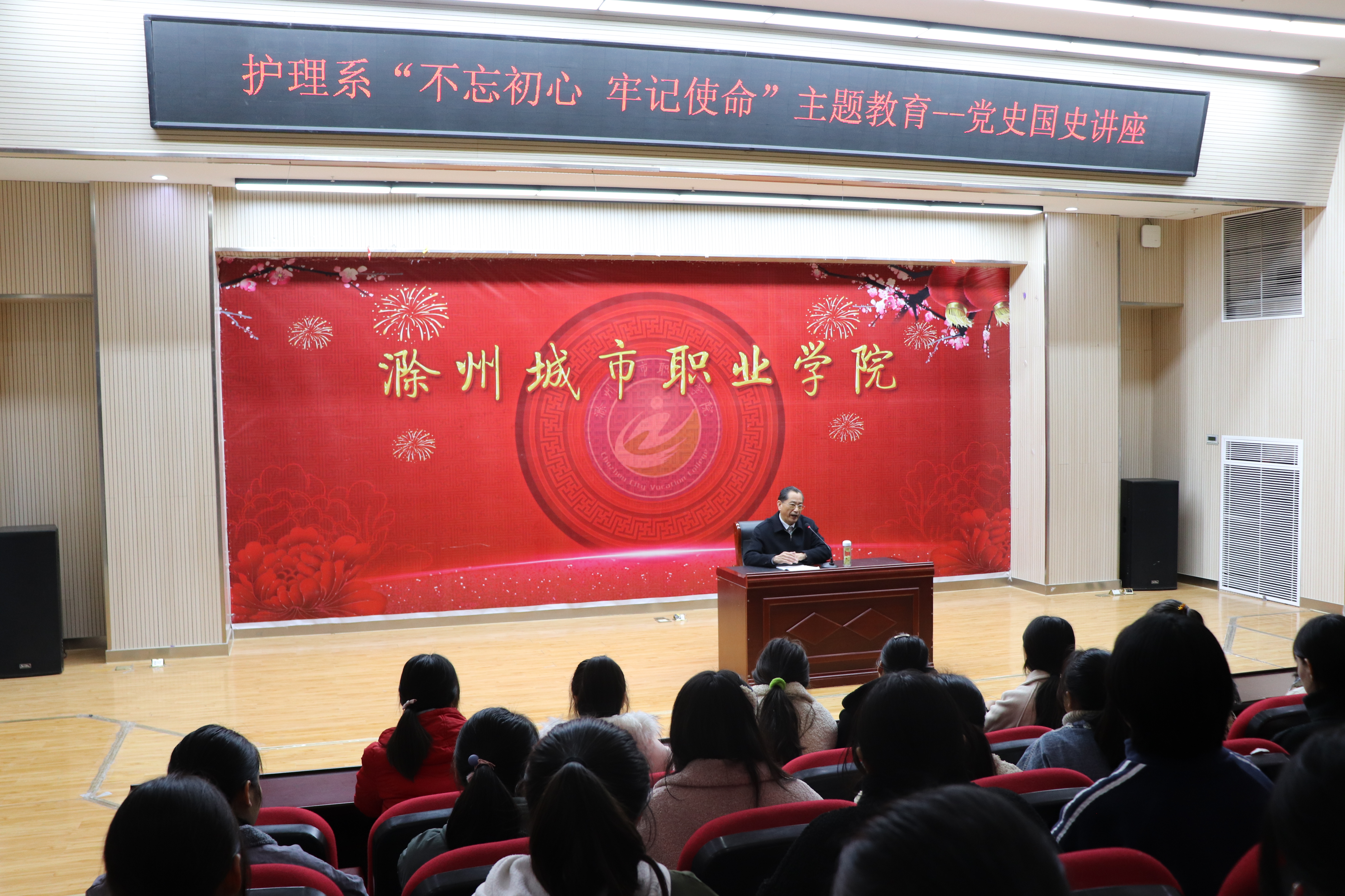 11月25日晚,护理系“不忘初心、牢记使命”主题教育党史国史专题讲座在图文中心报告厅举行。护理系邀请滁州市教体局机关党委委员、市教育体育局关心下一代工作委员会俞凤鸣主任为入党积极分子、主要学生干部和部分学生代表做了“学习党史国史 增强爱党爱国情怀 献身伟大中国梦”主题讲座。系党总支书记蔡季秋主持讲座。