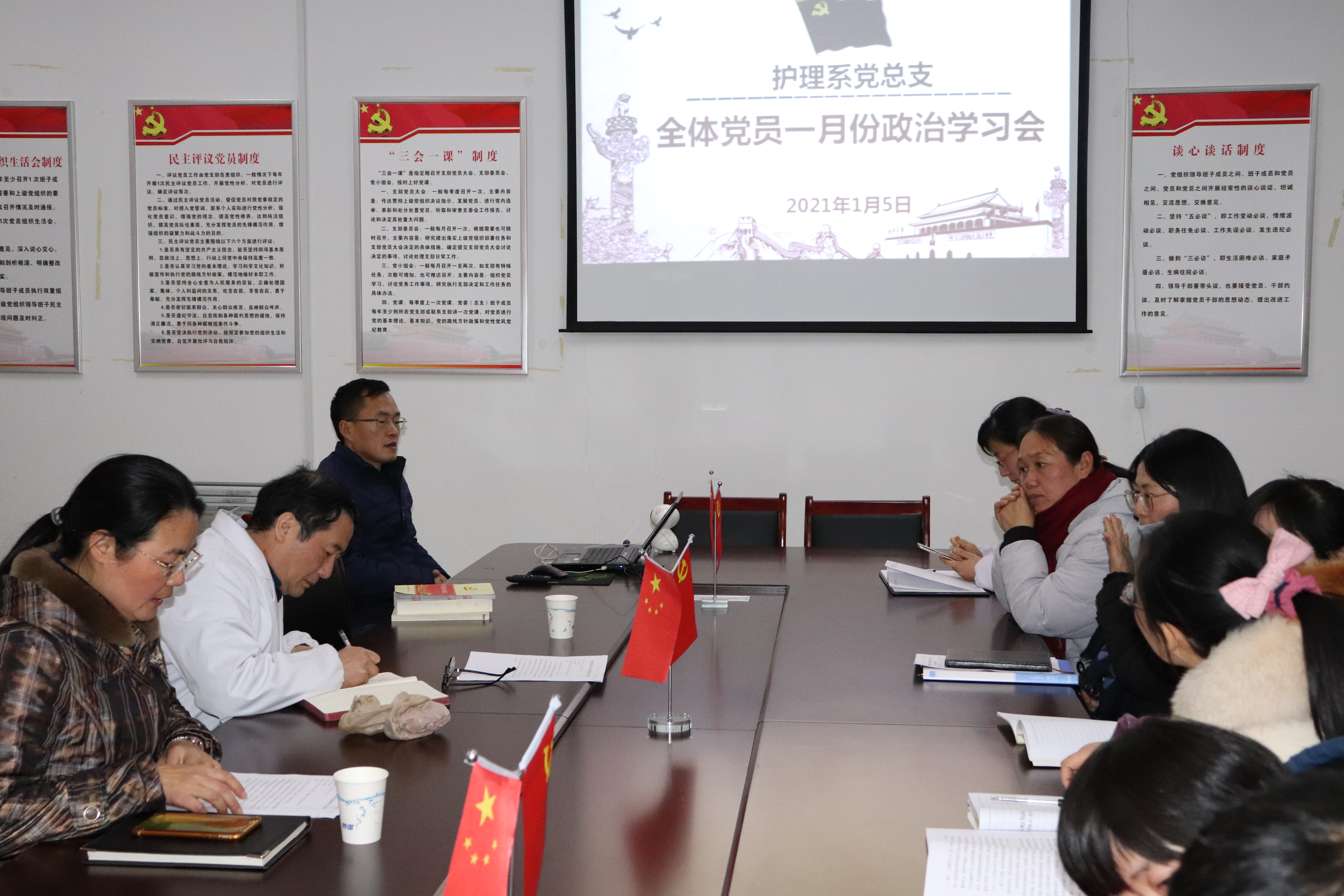1月5日下午,护理系党总支在B3-106召开党员大会,开展一月份主题党日学习活动。系党总支书记蔡季秋主持会议,系党总支全体党员参加学习。