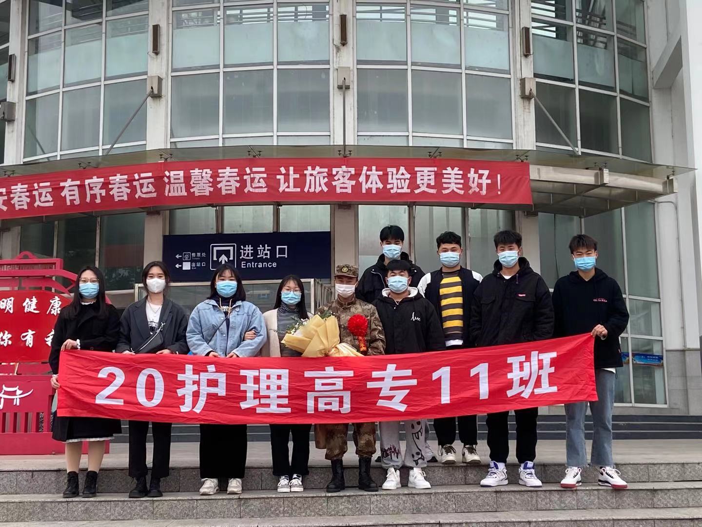 积极响应祖国号召,踊跃报名参军去,3月17日下午2时许,滁州城市职业学院护理系2020级护理高专11班部分学生代表前往滁州站欢送入伍学生张伟。