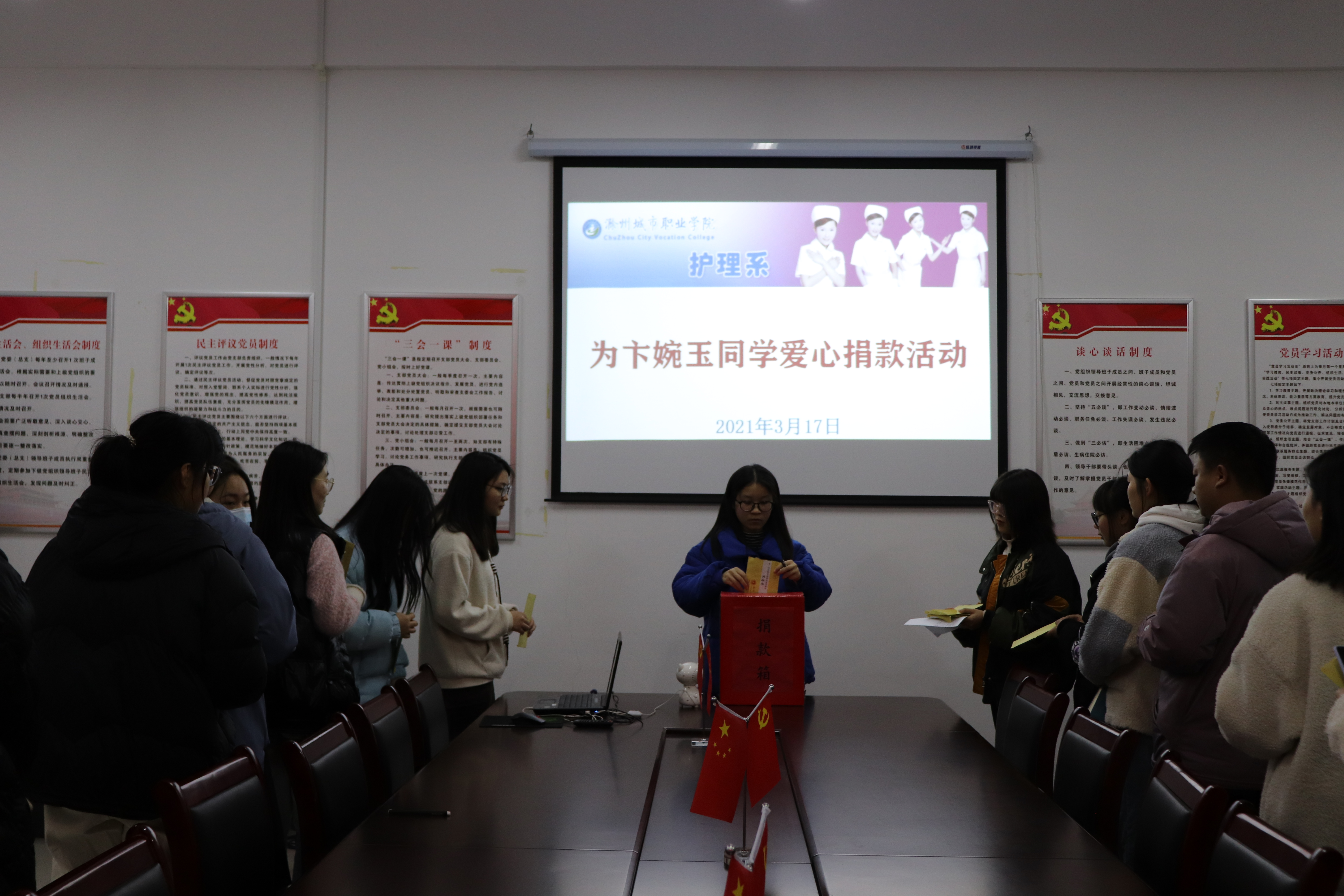 3月是学雷锋志愿服务月,我们都是雷锋精神的传承者,尽自己的微薄之力帮助他人,体验感动和力量的同时,也传递着希望和坚强。 病魔无情,人间有爱,捐款并不是最重要的,最重要的是能让卞碗玉知道身边有这么多人在关心着她,希望她能在困境中迎难而上,激发出战胜疾病的信心和力量!护理系全体师生共同祝愿卞碗玉同学早日康复!(文/图:王艳)