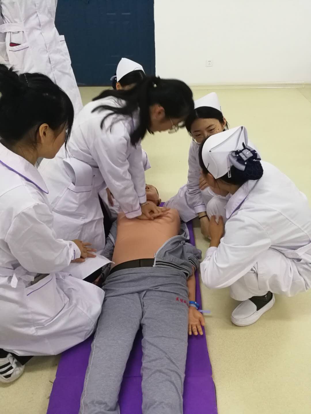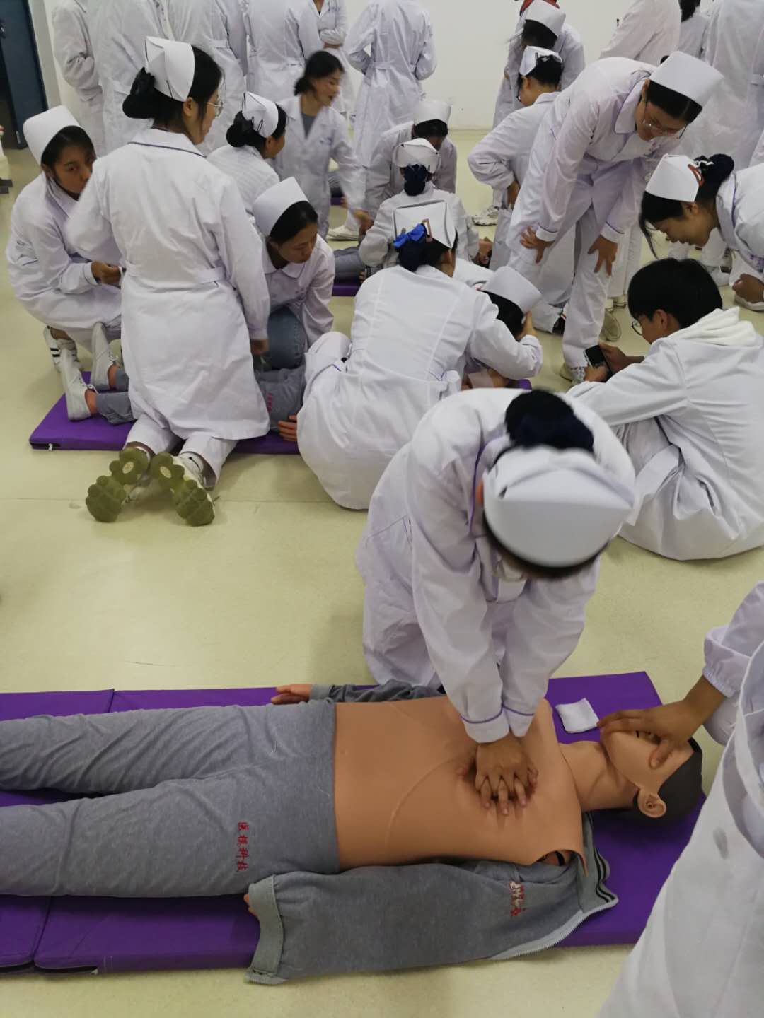 卢老师为学生讲解了心肺复苏、海姆立克急救法的基本技能,并进行了实践操作方面的培训。急救队队长、安徽省护理技能大赛二等奖获得者丁带娣、孙颖为同学做了获奖成果展示。同学们在模拟人上练习心脏复苏操作,大家热情高涨,边听边记,表现出了极大的兴趣。