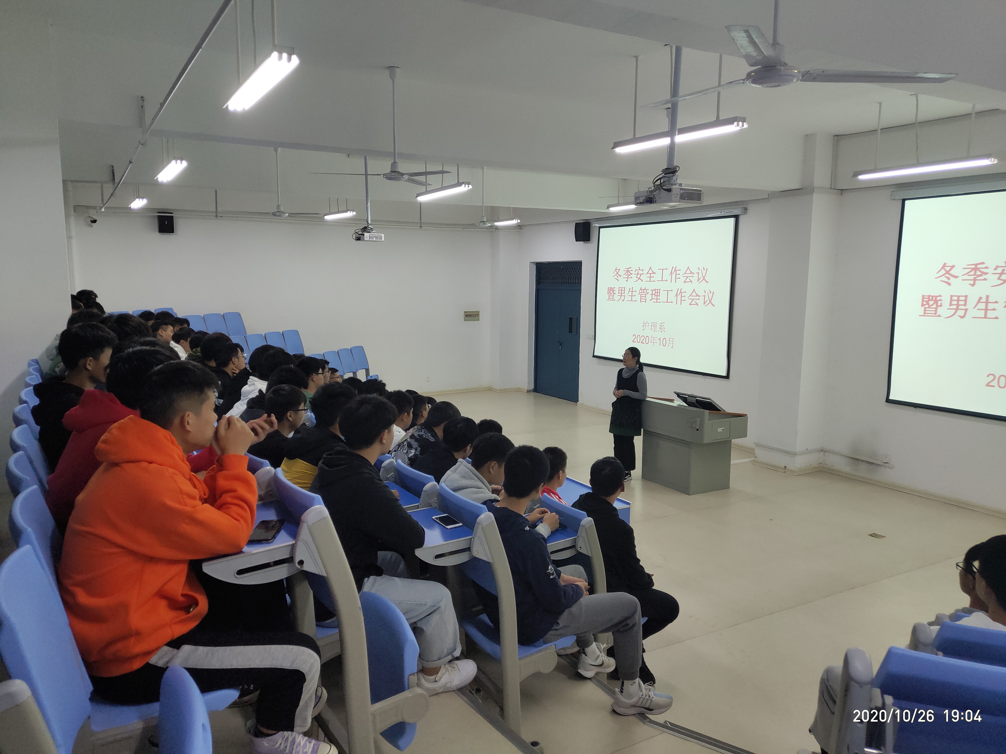 为防范校园安全隐患,营造安全、文明、和谐的学习生活环境,10月27日晚上,护理系在B3(110)教室召开了男生安全工作会议,会议由护理系党总支书记蔡季秋主持,全系男生参加了会议。