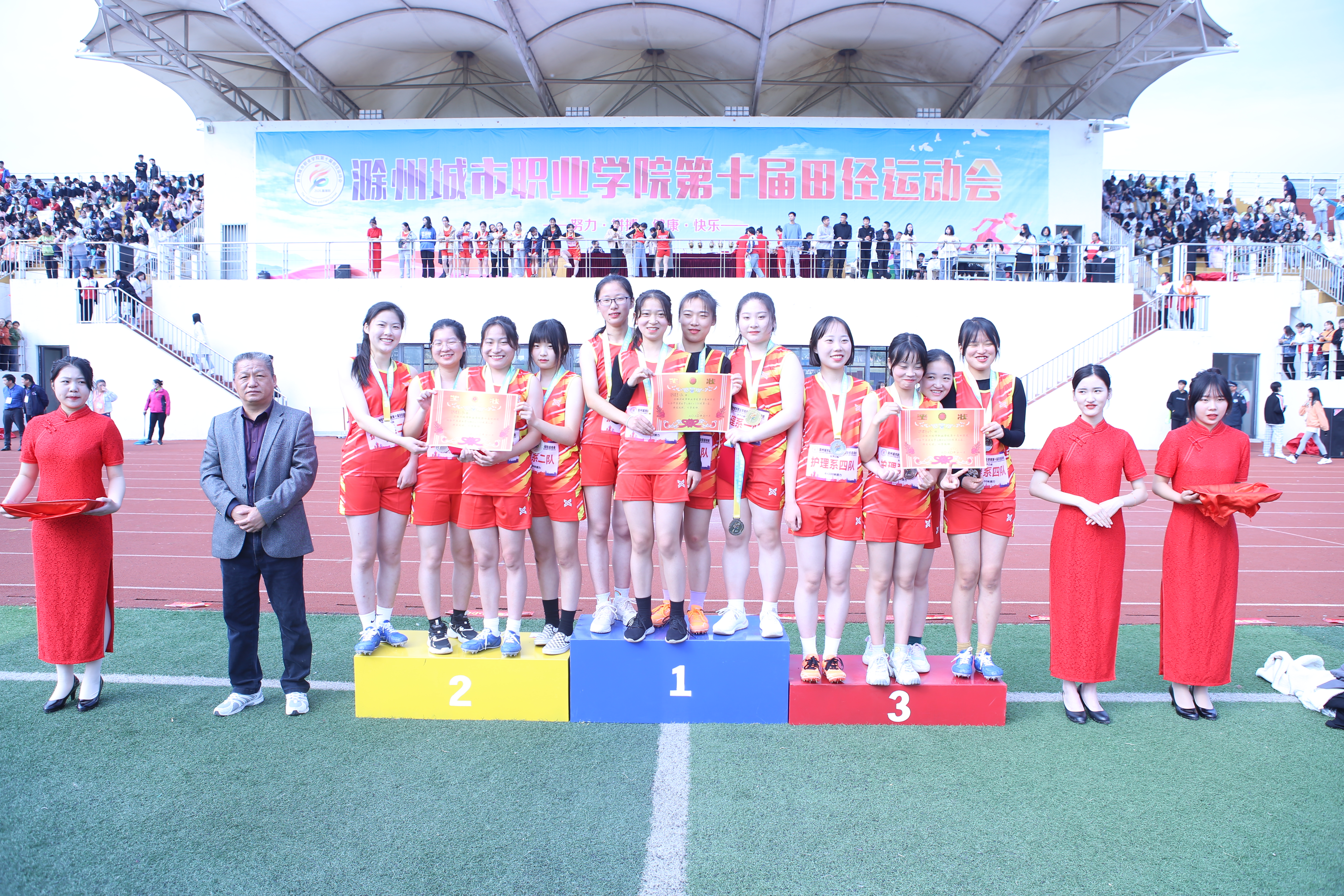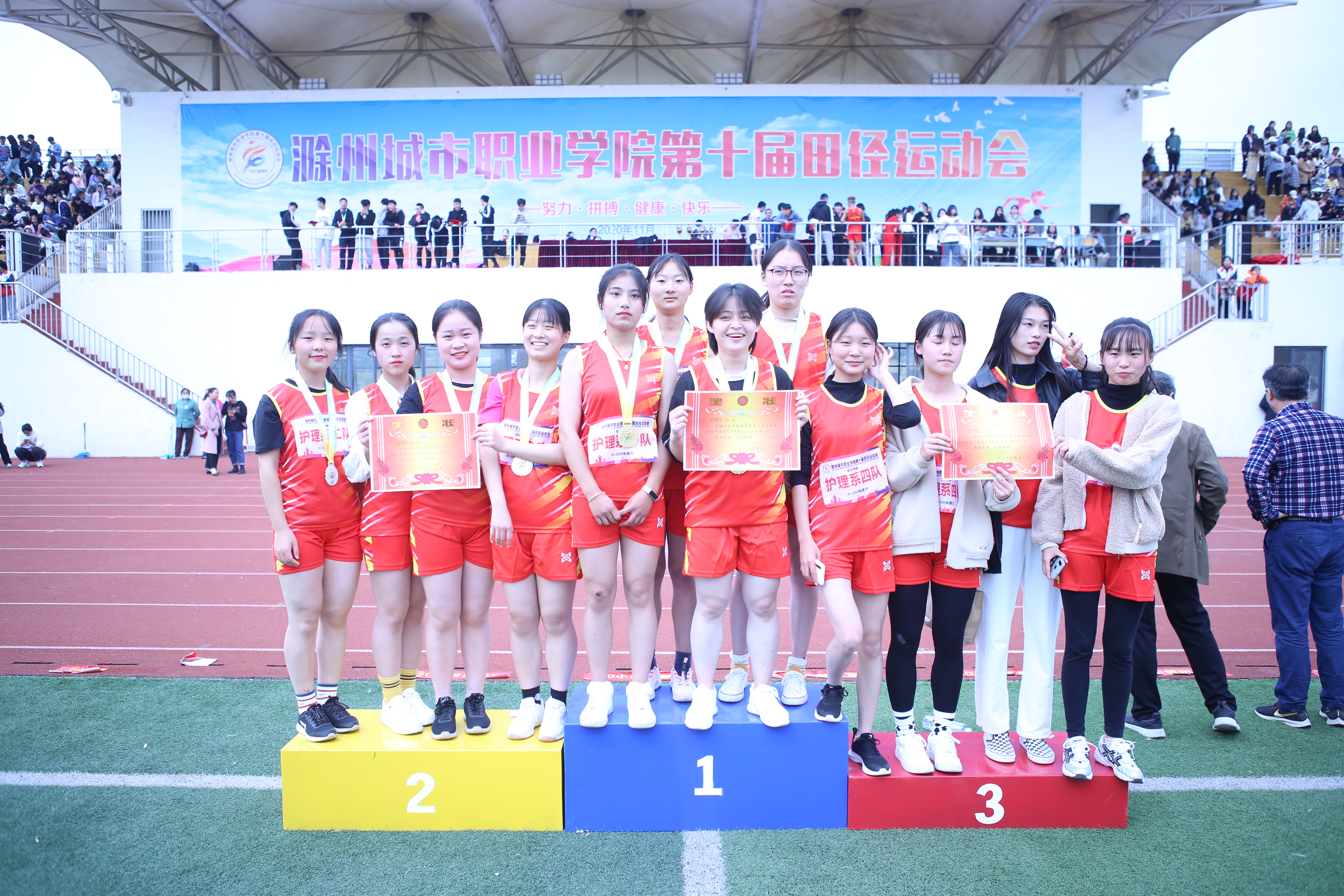 传承运动精神,展现青春风采,滁州城市职业学院第十届田径运动会于11月6日上午圆满落幕。历经两天半的激烈角逐,护理系运动员凭借昂扬的斗志、过人的实力、奋勇拼搏的体育精神,夺得了本届运动会女子甲组和女子乙组2项团体总分第一名,并以549.5分的好成绩蝉联团体总分第一名,连续四届夺得团体总分第一名。