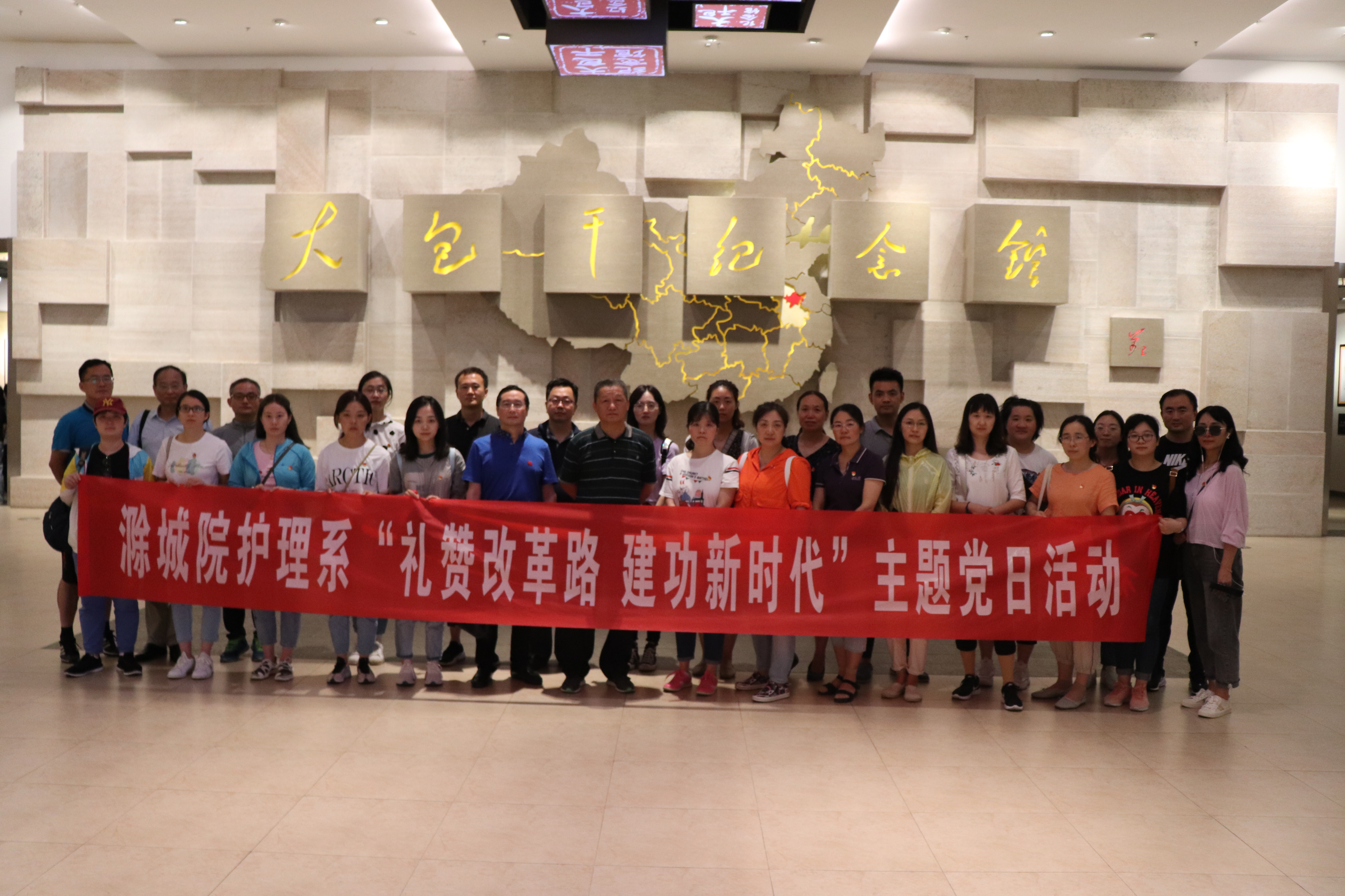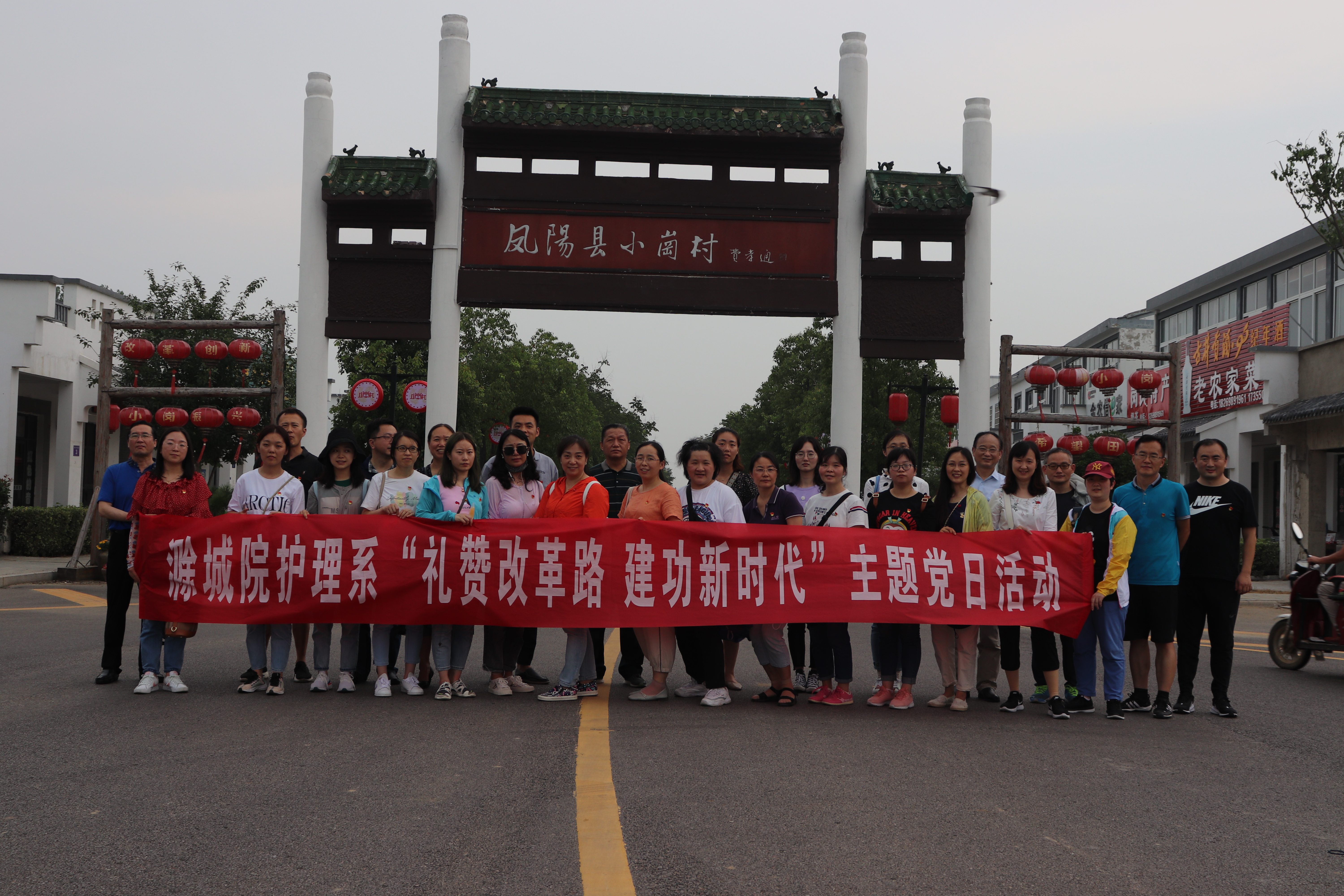 为了庆祝建党99周年,感悟改革发展历史,弘扬先进学习模范,进一步激发党员干部的改革创新意识和责任担当意识。7月7日,护理系党总支组织全体党员赴中国农村改革发源地——安徽省凤阳县小岗村开展主题教育活动。党委委员、副院长施向阳与系全体党员、部分学生骨干、入党积极分子近40人参加活动。
