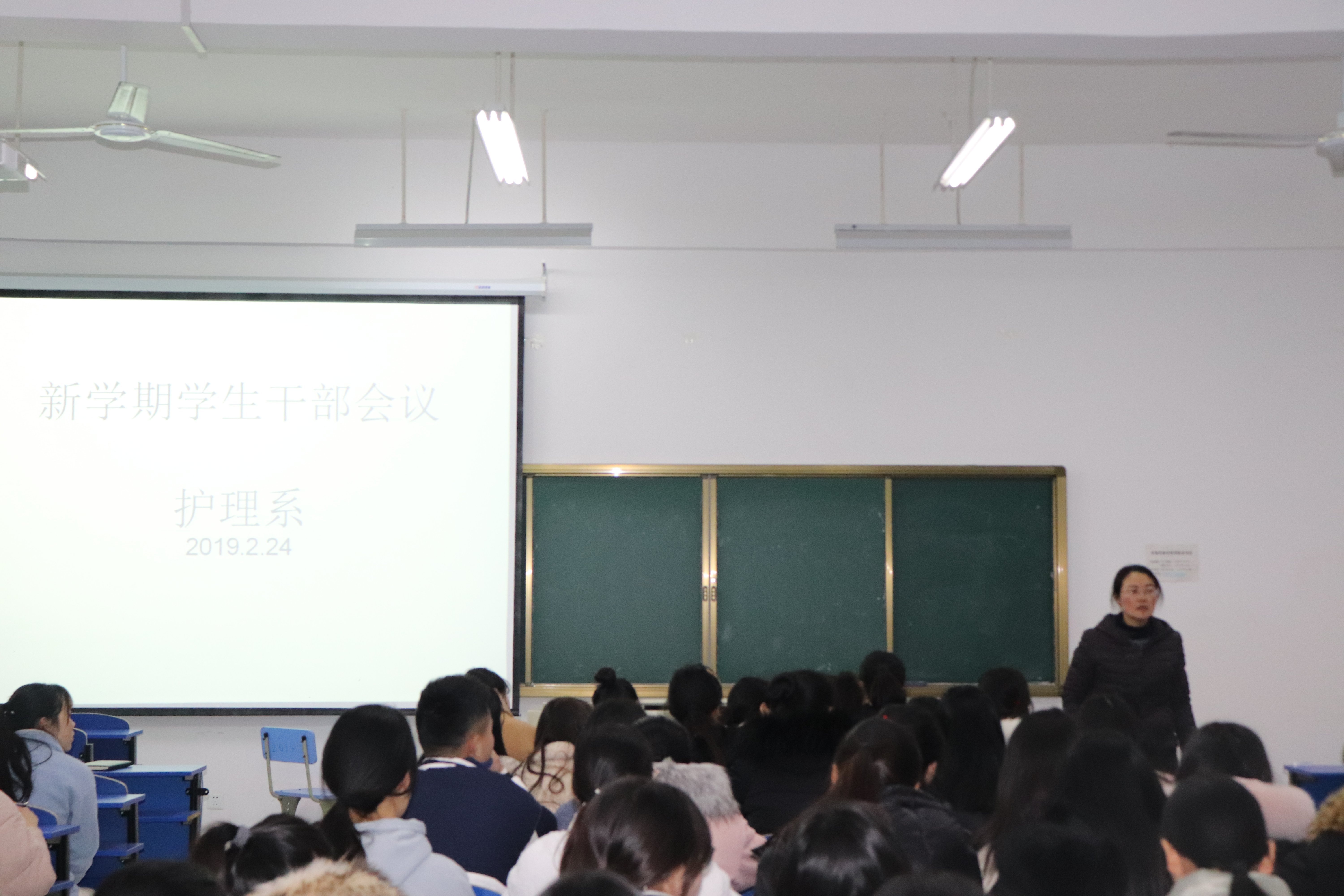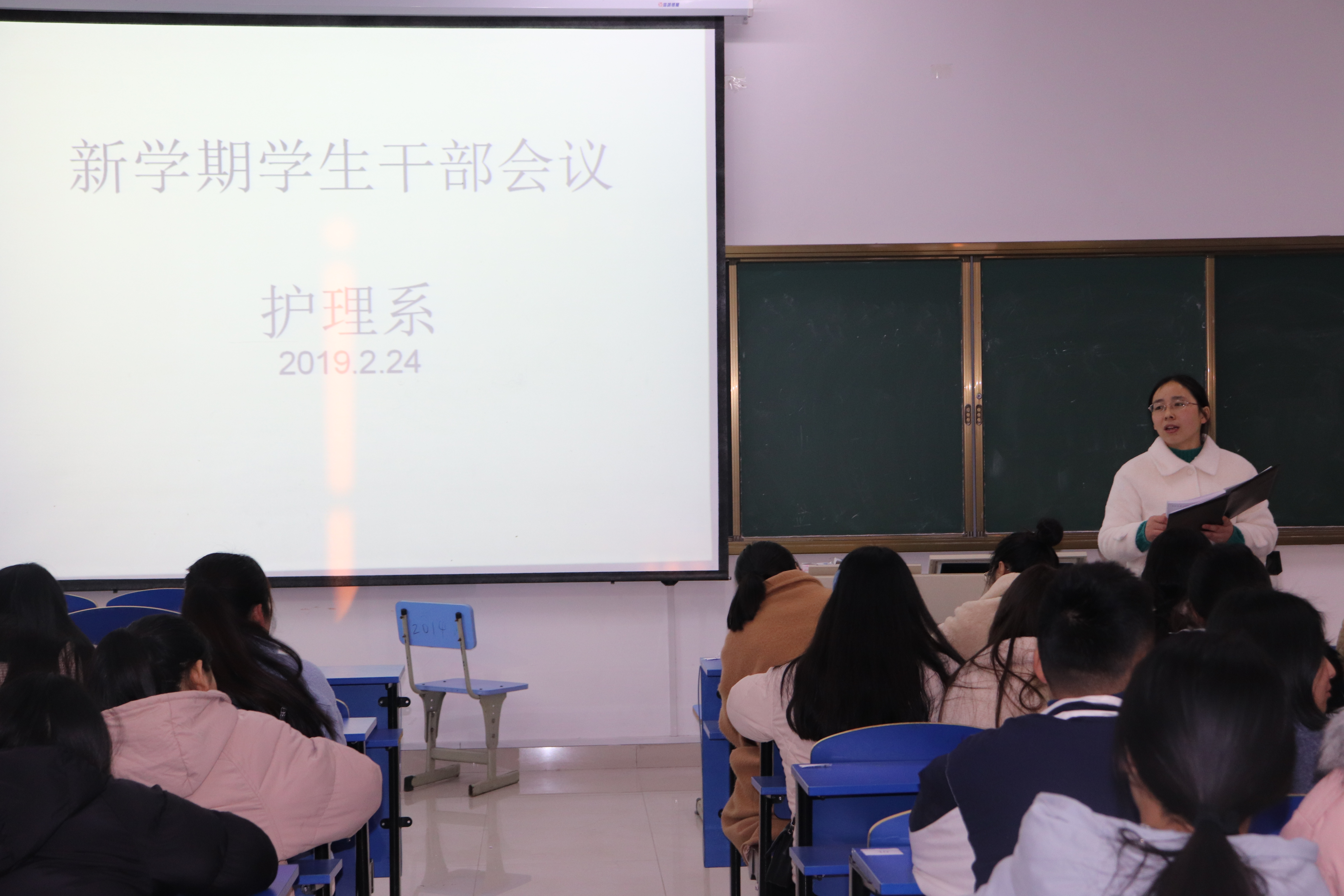 2月24日下午,护理系召开了本学期第一次学生干部会议,会议由护理系学管秘书卢齐伟主持,参加会议的有各班班长、学生会各部负责人及护理系社团负责人。系党总支书记蔡季秋、系团总支书记秦海娇参加了本次会议。