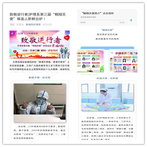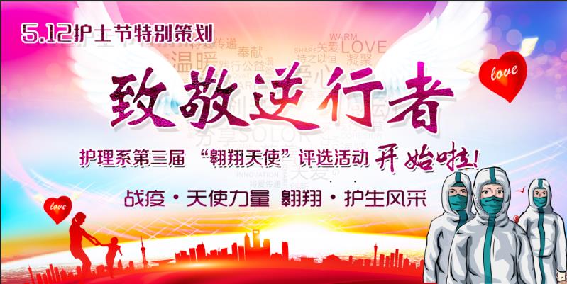 为贯彻落实疫情防控和“停课不停教、停课不停学”工作的安排部署,引导广大团员青年深入学习贯彻习近平新时代中国特色社会主义思想和党的十九大精神,继承和弘扬南丁格尔精神,落实立德树人的育人根本任务,进一步加强大学生思想道德建设,树立和培育社会主义核心价值观,不断促进校风、学风建设,弘扬正气,褒奖先进,在学生中发挥优秀模范典型激励、榜样引领的作用。4月中旬以来,护理系开展了“致敬逆行者”主题为“战役•天使力量 翱翔•护士风采”翱翔天使评选活动。
