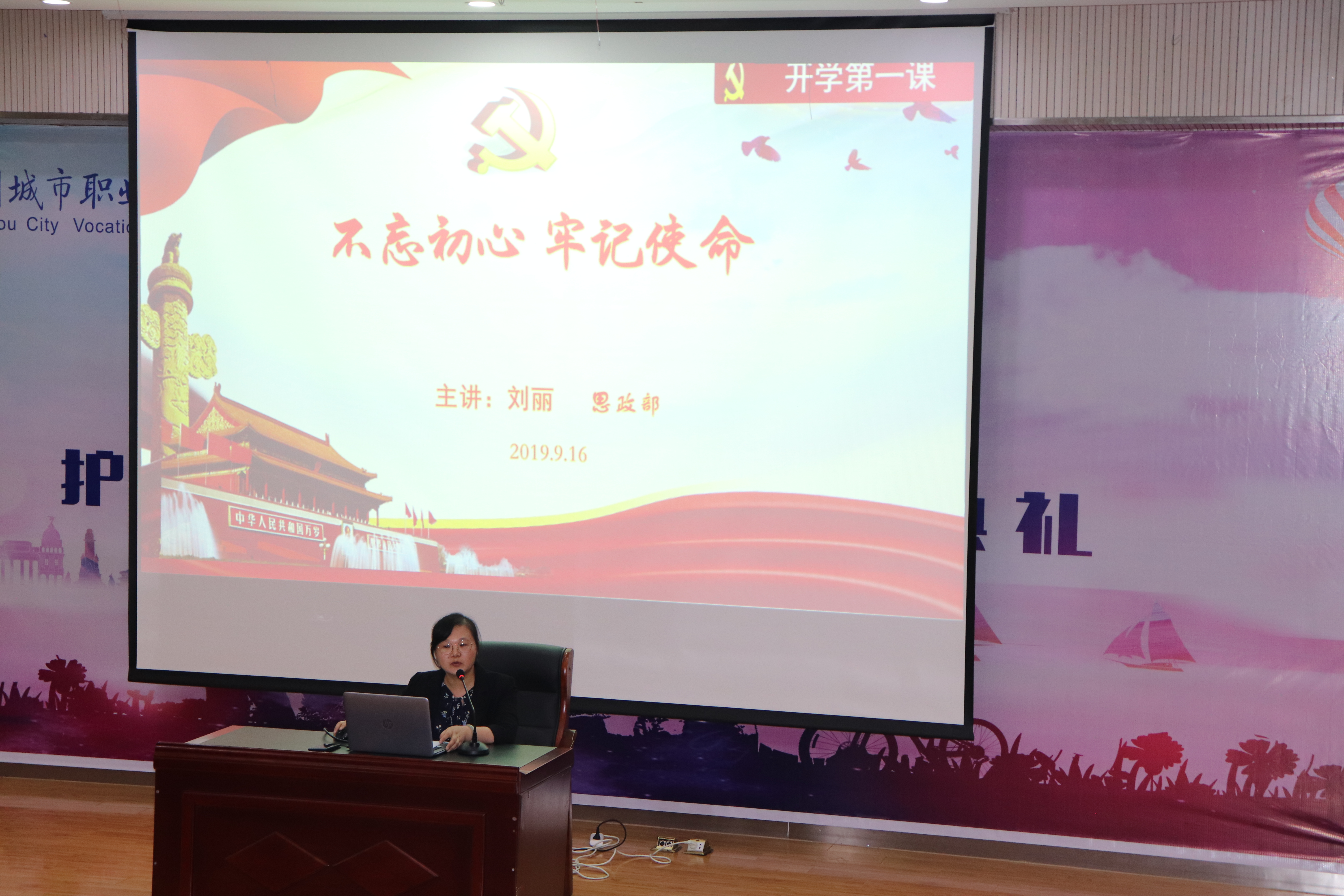 本次入学教育活动分为两个部分。第一部分由思政部刘丽老师为学生开展主题为“不忘初心、牢记使命”的开学第一课,围绕“初心使命、家国情怀”“青春奉献、投身实践”“创新创业、放飞梦想”“大学生活、激情飞扬”四个方向,为现场新生们带来了一场别开生面的思政公开课。激励学生们要厚植家国情怀,练就过硬本领,带着梦想奋斗,走好新时代青年自己的长征路。