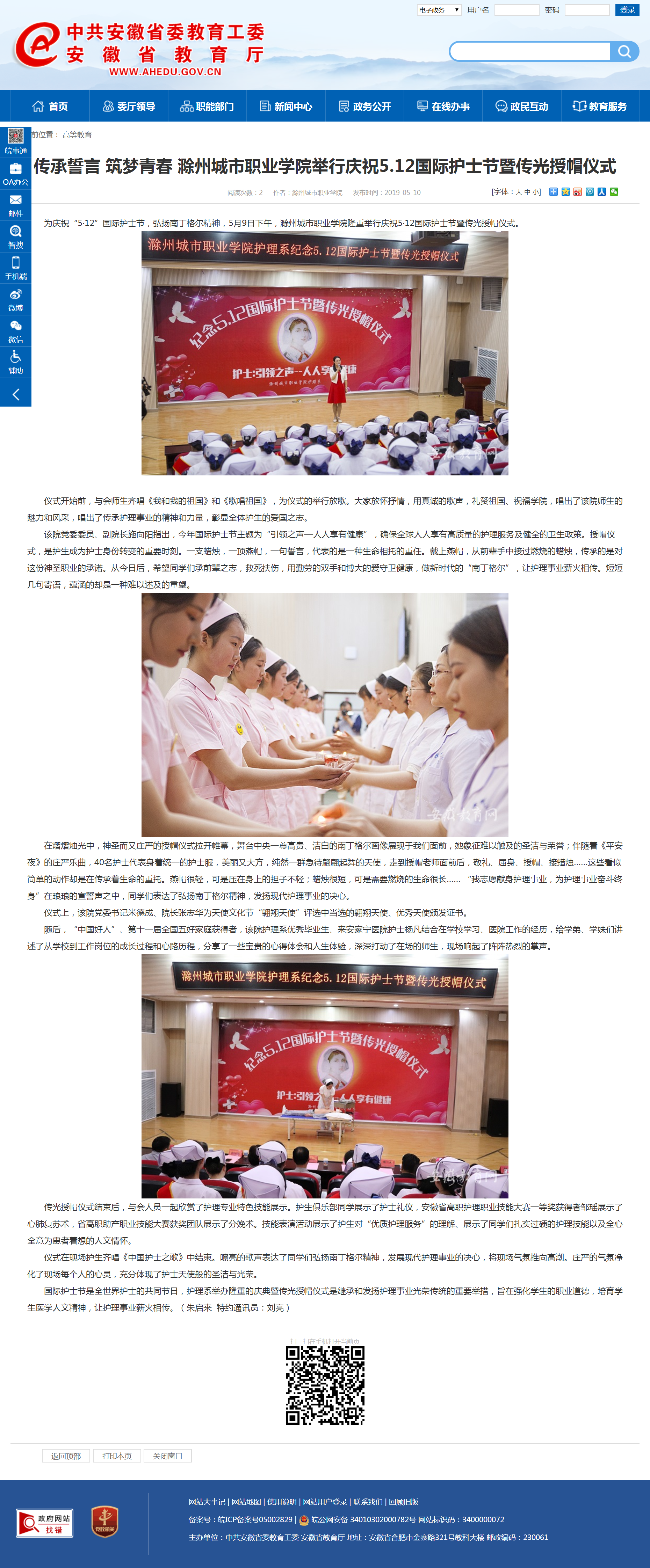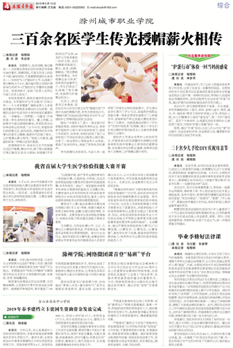 5月9日,护理系隆重举行纪念5·12国际护士节暨传光授帽仪式,滁州市电视台、晥东晨刊等媒体记者闻讯前来报道本次活动。记者们感受了传光授帽仪式的隆重、圣洁和庄严,他们迫不及待地发出消息。仪式后几天,活动新闻报道见诸报端、电视台与网络。安徽青年报、晥东晨刊刊发在报纸的头版显要位置,安徽教育厅官网、滁州市委市政府门户网站等媒体图文并茂宣传报道活动,宣传效果明显,点击率很高。