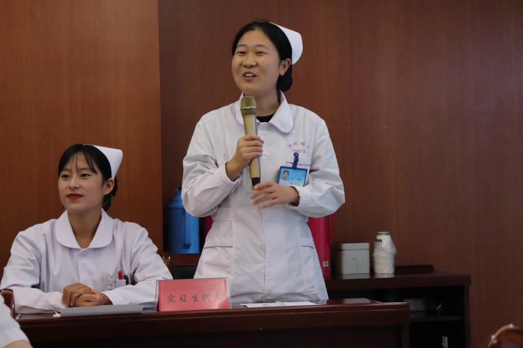 张志华书记十分关心实习同学们的学习、生活和工作情况,在与学生座谈会上反复关注学生加强自身安全,切实做好疫情防控工作。她希望同学们要有仁爱之心,有爱伤意思,也要有诚恳虚心向带教老师学习,不断充实知识、提升专业技能,更要有团结互助,共同努力,优势互补,加强学习,努力提升自我。她预祝同学们在实习期间工作愉快,身体健康。实习生代表黄佳乐、丁带娣两名同学表达了会珍惜时光,努力学习专业技能,不断提升护理专业素养,争取早日成为新时代合格的“白衣天使”。