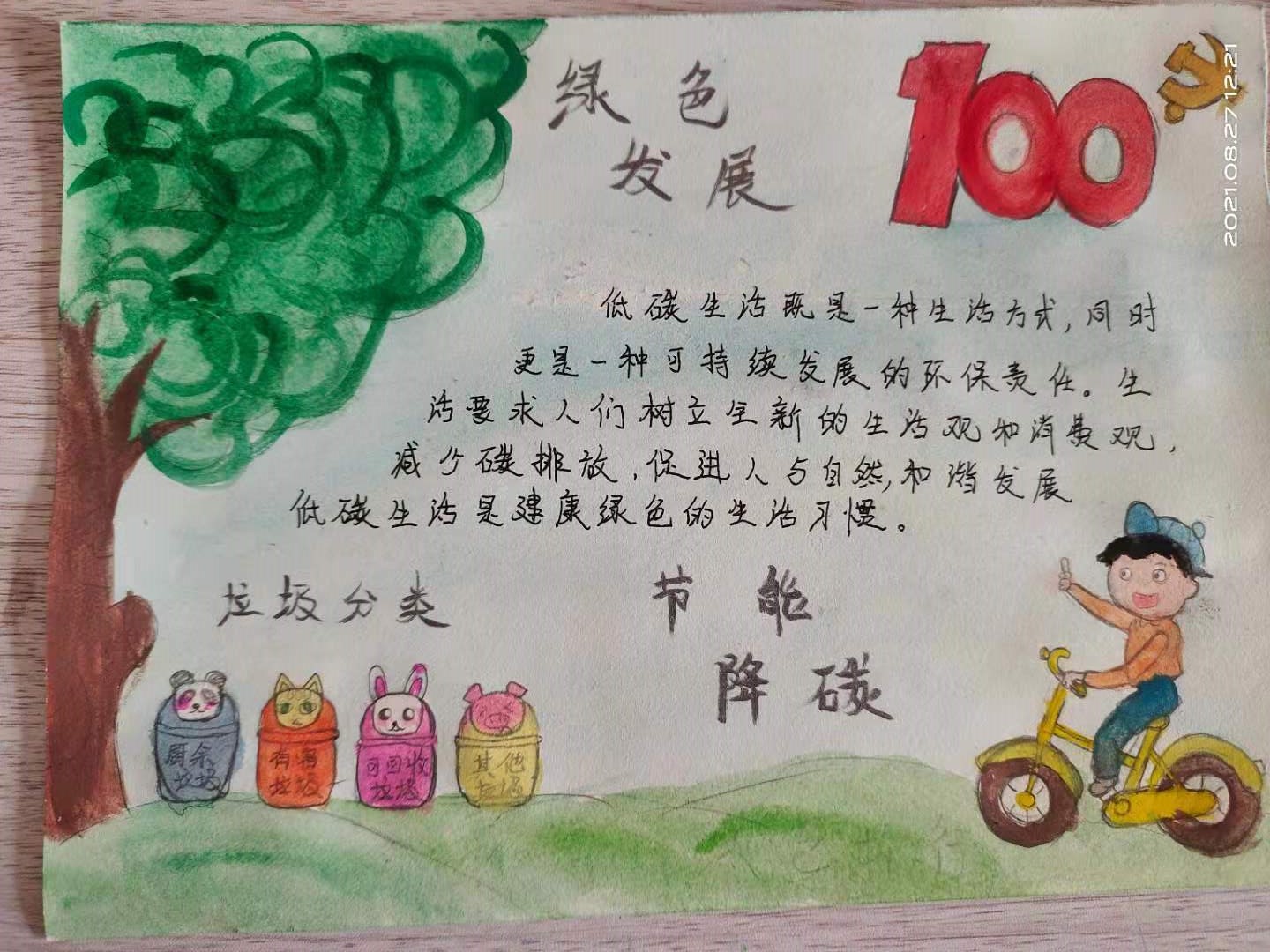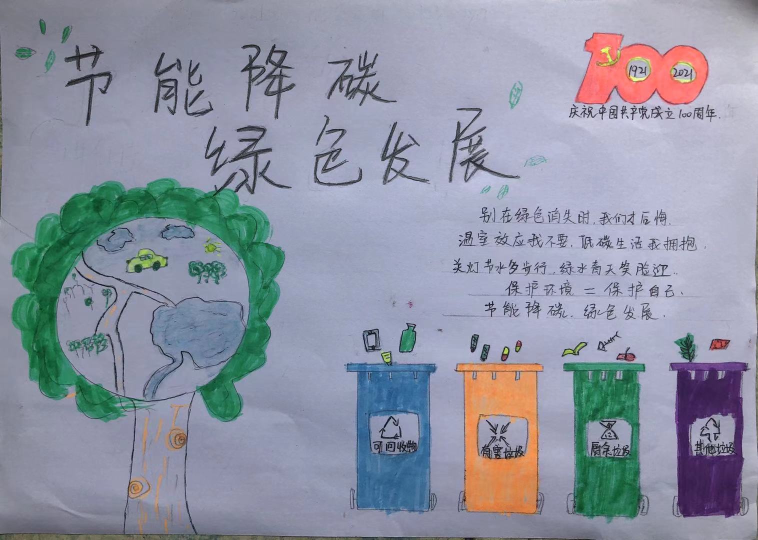 在线上,我系青年学生参与了国家发展改革委会同有关部门开展的“节能云视界”“节能云课堂”“技术云展示”“趣味云闯关”“活动云分享”一系列“云”上活动;“云”上活动直观生动,不仅普及了节能降碳知识,还对提升全民节能意识、培养节能能力和引导人们积极形成绿色低碳生产生活方式非常有益。在线下,同学们制作手抄报倡导绿色出行、节能减排,传播绿色低碳发展理念。同学们还通过微信群积极讨论如何从点滴做起,践行绿色低碳生活,例如垃圾一定要做到正确分类、养成节约用电的好习惯、外出时环保出行、随手关电脑代替待机、多种一棵树、减少使用一次性产品等等;在家中、在小区、在公共场所,同学们积极倡导家人、行人关注和参与“节能降碳,绿色发展”。