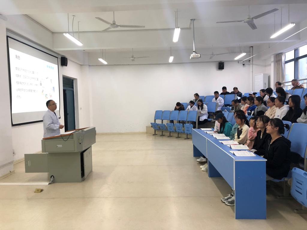 新进教师宋克春老师公开课的主题是《病人角色》,他充分利用个人临床工作优势,将课本内容结合临床实例;语言清晰准确、内容熟练,教态自信大方;积极与学生互动,创造良好的课堂学习环境。课堂上,学生听课认真、反馈积极,教师仔细听讲、详细记录。