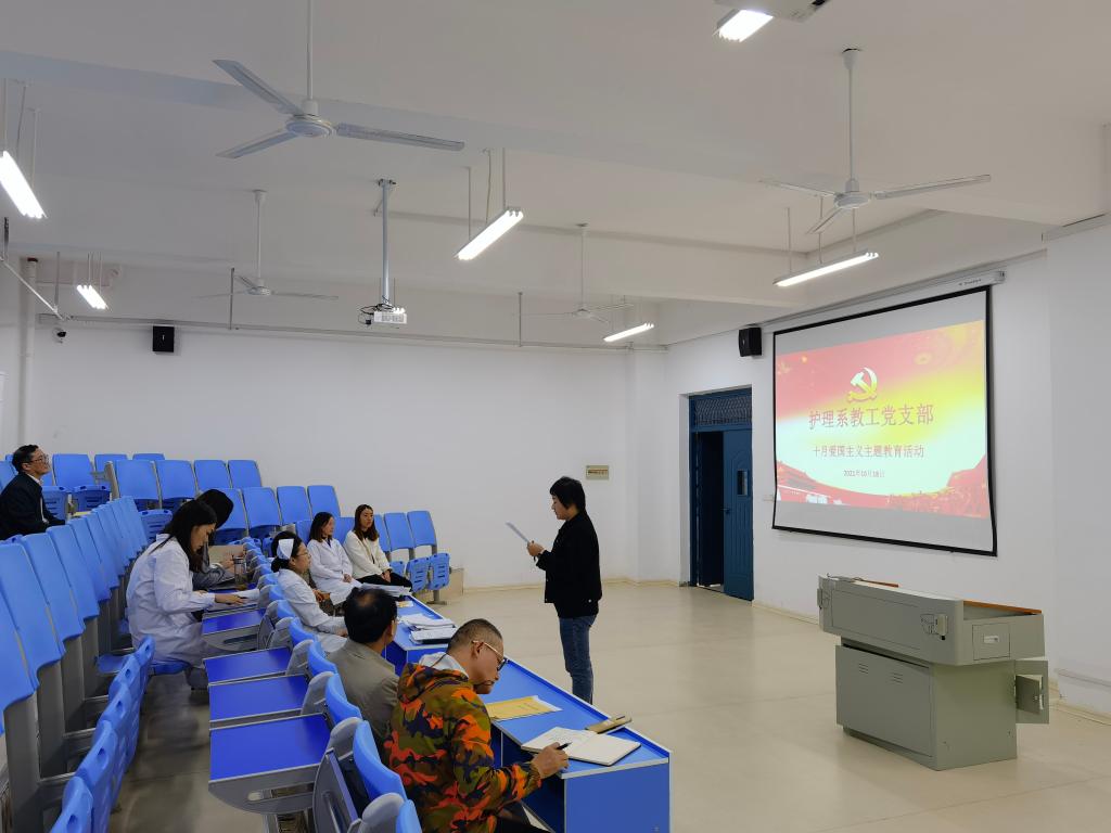 为庆祝新中国72周年华诞,深入推进爱国主义学习教育实践活动,护理系教工党支部10月18日下午在B3-110开展十月爱国主义教育主题学习活动,会议由支部书记左晶晶主持。