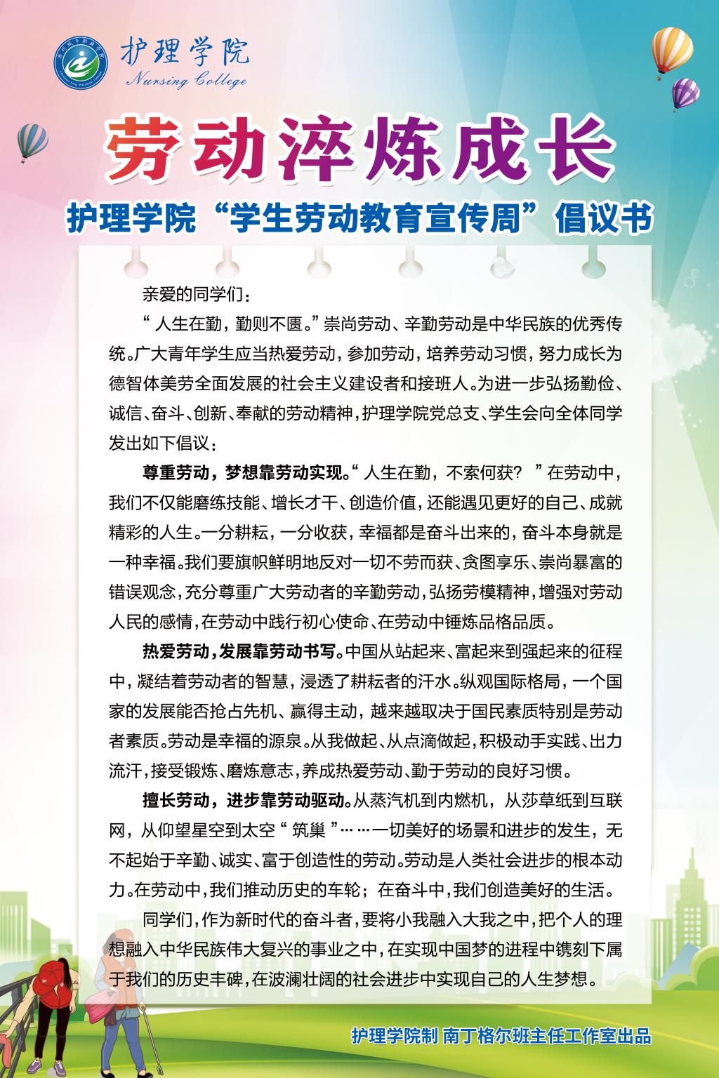 为贯彻安徽省政府印发的《实施德智体美劳“五大行动”全面提高育人质量工作方案》要求,进一步营造崇尚劳动、尊重劳动、热爱劳动的良好氛围,以劳树德,以劳育美,展示护理学院学子勤勉自持、积极向上的劳动风采,5月9-15日,护理学院聚焦立德树人,推进“三全育人”,坚持“五育并举”,着力加强新时代大学生劳动教育,在全院集中开展了以“劳动淬炼成长 实践创造幸福”为主题的“劳动教育宣传周”活动。