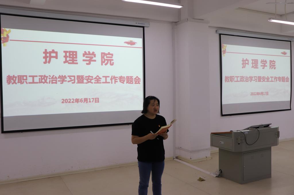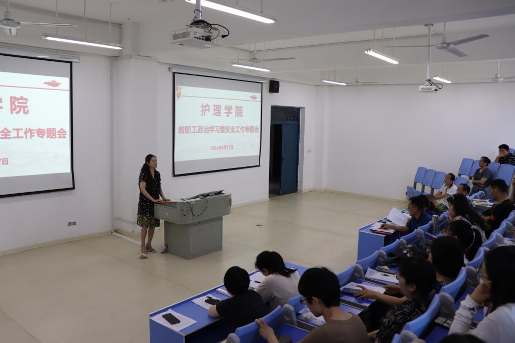 6月17日,护理学院在B3-110召开全体教职工大会,开展政治学习和安全生产月专题学习,部署暑期教育教学和安全工作。护理学院党总支书记蔡季秋主持会议,全体教职工参加会议。