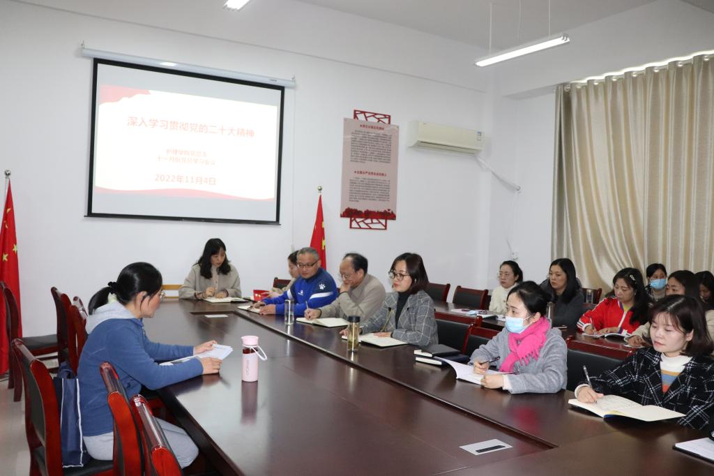 为深入学习党的二十大精神,2022年11月4日下午,护理学院党总支在党员活动室再次深入学习了习近平总书记在中国共产党第二十次全国代表大会所作的报告。由护理学院党总支书记蔡季秋领学,全体党员参加了学习。