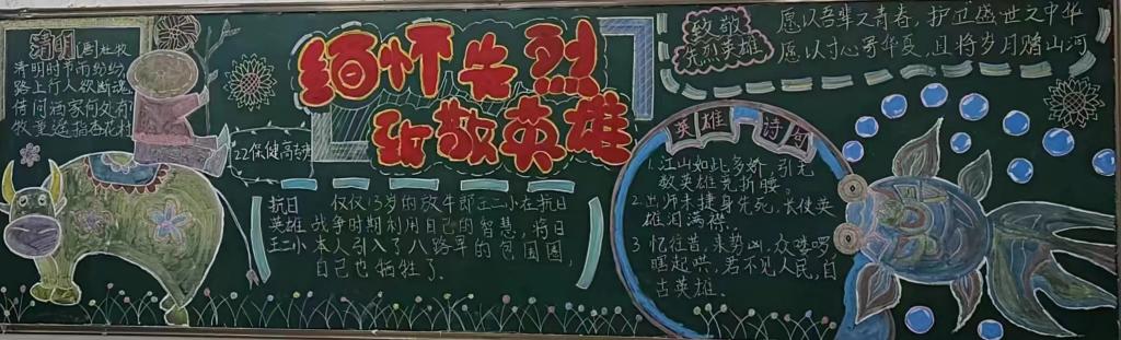 “紧扣爱国主题,培育新时代青年”——一是各班级召开主题班会,紧紧围绕“清明节的来源”“移风易俗”以及“缅怀革命先烈”等内容,展开讨论交流,引领学生深入挖掘清明节文化内涵。二是通过“清明祭英烈”手抄报、观看爱国主义电影、黑板报创作等形式多样的活动,引导团员青年慎终追远、缅怀先辈,铭记历史、学会感恩,继承先烈遗志,珍惜幸福生活。