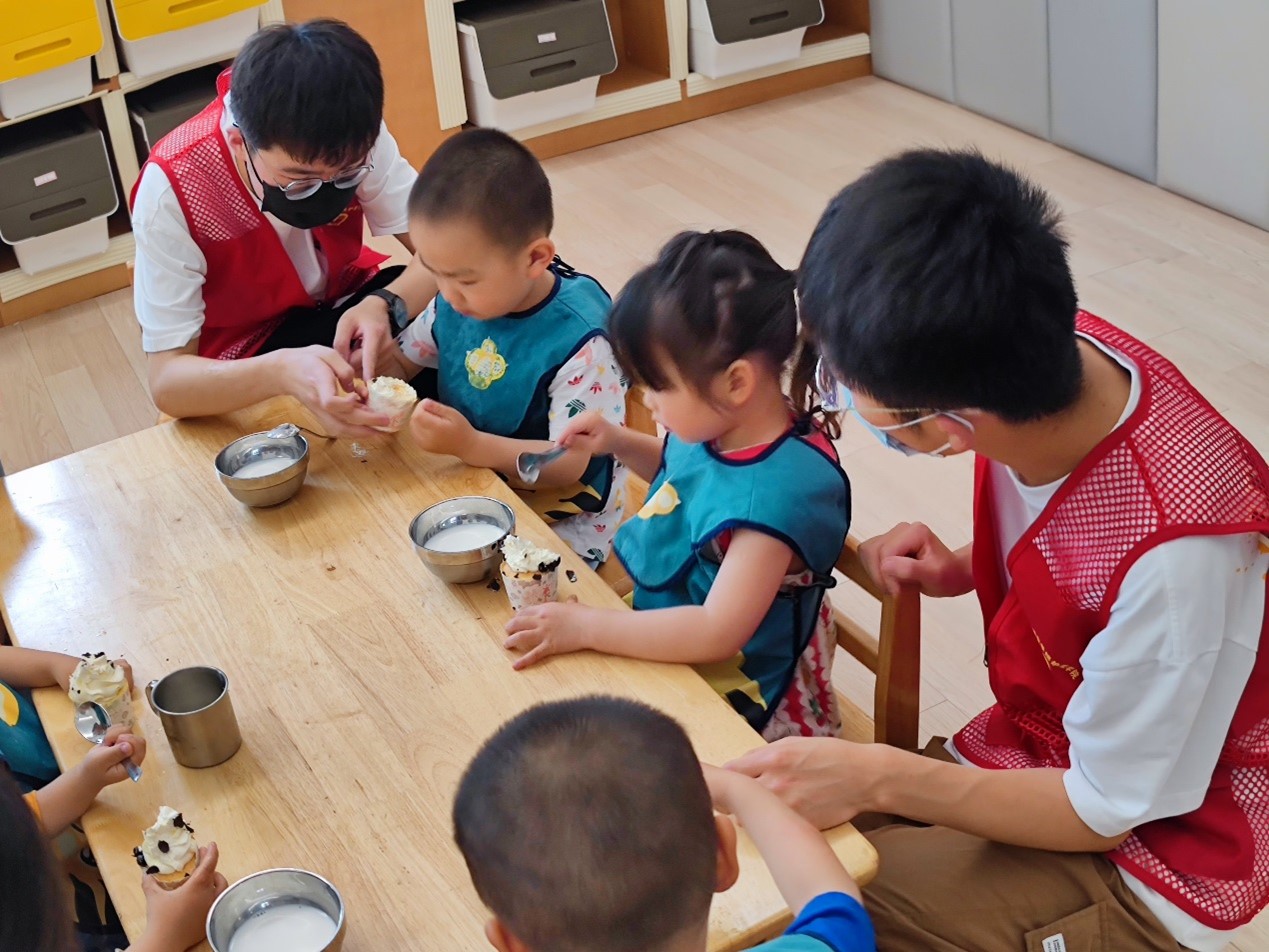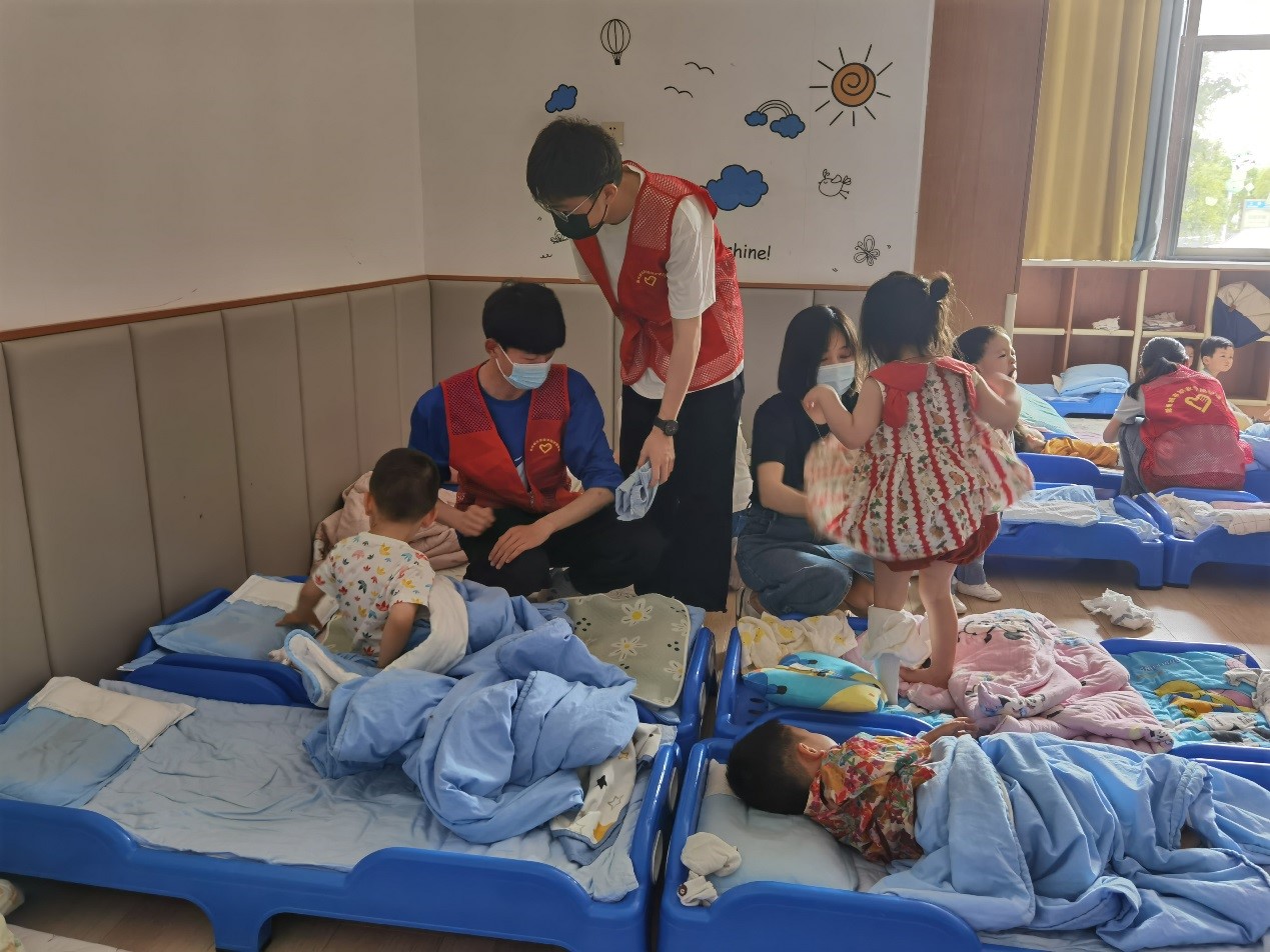 活动伊始,青年志愿者们在孩子们的梦中到访,随着阿姨们将午睡结束的孩子们一一喊醒,志愿者们运用所学知识,辅佐孩子们穿上衣裳、收拾被褥,在阿姨们的指引下带着孩子们洗漱完毕,准备迎接今日份的下午茶点。在孩子们享用下午茶点的时候,志愿者们专心陪伴,以免孩子们在吃东西的时候发生意外情况,充分体现了幼托专业志愿者的专业能力和护理专业志愿者的专业素养,使得孩子们更安全、更快乐的度过了茶点时光,之后在阿姨的带领下一起伴歌同舞,在轻松的氛围中度过了愉快的时光。