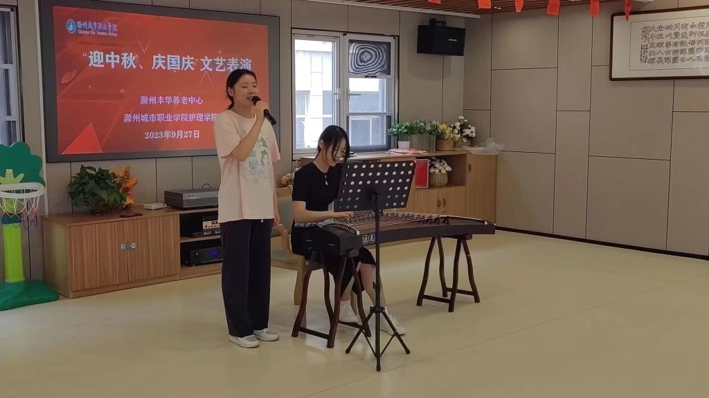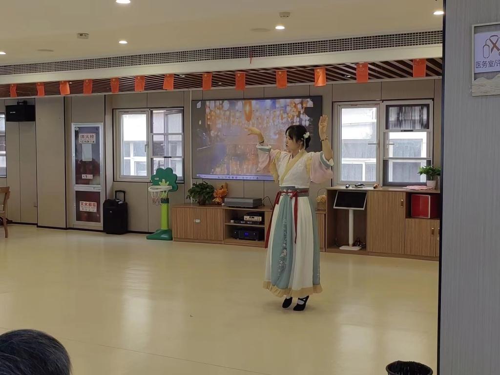 同学们为老人们精心准备了多个适合他们欣赏的节目,为他们送去了节日的问候和祝福。歌曲《我和我的祖国》、古筝伴唱《万疆》、古典舞《但愿人长久》,朗诵《祖国你就是我要唱的那首歌》等,这些节目瞬间唤起了老人们年轻时的记忆,一首首爱国歌曲激起老人们内心洋溢的家国情怀。