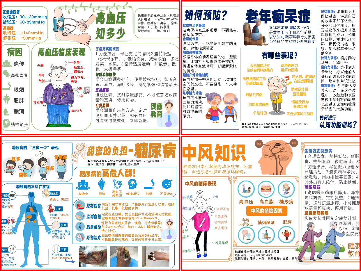 随着人口老龄化的不断增加,失智失能的人群也越来越多,如何做好失能失智的预防和照护,显得尤为关键。为保证本次培训效果,项目负责人先期会同民政局调查确认培训对象、制定培训计划;校党委委员、副校长吴惠珍教授带领团队教师集体备课,确认失智失能照护培训重点,并针对常见的痴呆症、高血压、糖尿病、中风等慢性病健康教育制作了宣传彩页。