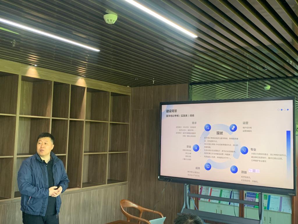座谈会在图文中心七楼教工之家举行,李宝山表示筑医台产业科技有限公司是立足于滁州发展的企业,在发展的快车道上人才需求是急需解决难题,特别是医学和科技的复合型人才市场基本处于空白。他认为,当前产业迭代速度快,对于人才的需求也在不断变化,他期待能和学校在联合培养人才中共同发挥积极作用。随后,筑医台技术人员通过PPT介绍了新产业背景下企业在教育行业建设规划,分析了当前行业形势,对下一步企业在医学教育行业的发展进行了展望。