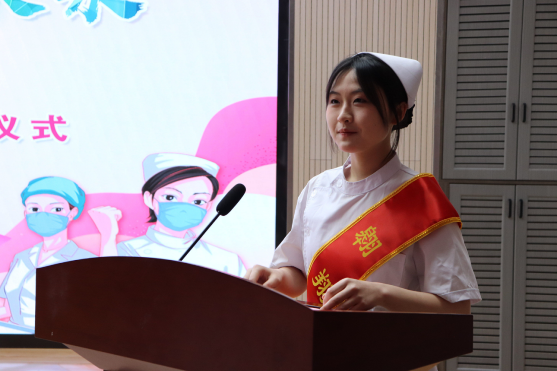 神圣而庄严的传光授帽仪式环节是活动最重要的环节。在庄严的乐曲声中,身着统一护士服的护生代表们迈着坚定的步伐走向台前。护理前辈手持象征圣洁与责任的燕尾帽,逐一为即将步入护理岗位的学生们戴上,并送上最真挚的祝福和期望。护生们在接过前辈手中的蜡烛时,也接过了他们对护理事业的热爱与执着。这一刻,全场肃静,音乐的旋律和师生们的心跳声交织在一起,共同见证这一神圣而又庄严的时刻。传光授帽仪式后,沐菊老师带领全体护生庄严宣誓:“终身纯洁,忠贞职守......”在宣誓的过程中,每一位护生的脸上都写满了庄重与自豪。她们深知,自己即将踏上一条充满挑战与责任的道路,但他们也相信,只要坚持初心,不断努力,就能够成为一名优秀的护士,为人类健康事业贡献自己的力量。